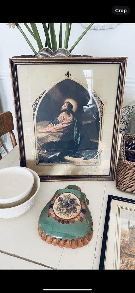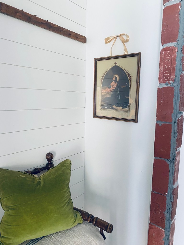 Thrifted to styled… antique framed print of Christ 🤍 #antique #jesus #lovehim #savior #thriftedtostyled #entryway #thriftstorefinds #deseretindustries #happysaturday #handmedowncottage #furnitureattiffanys