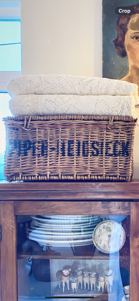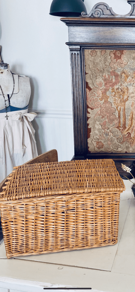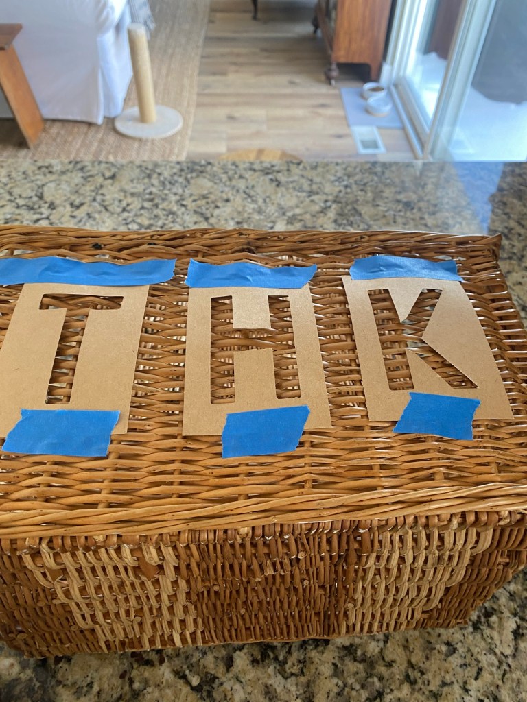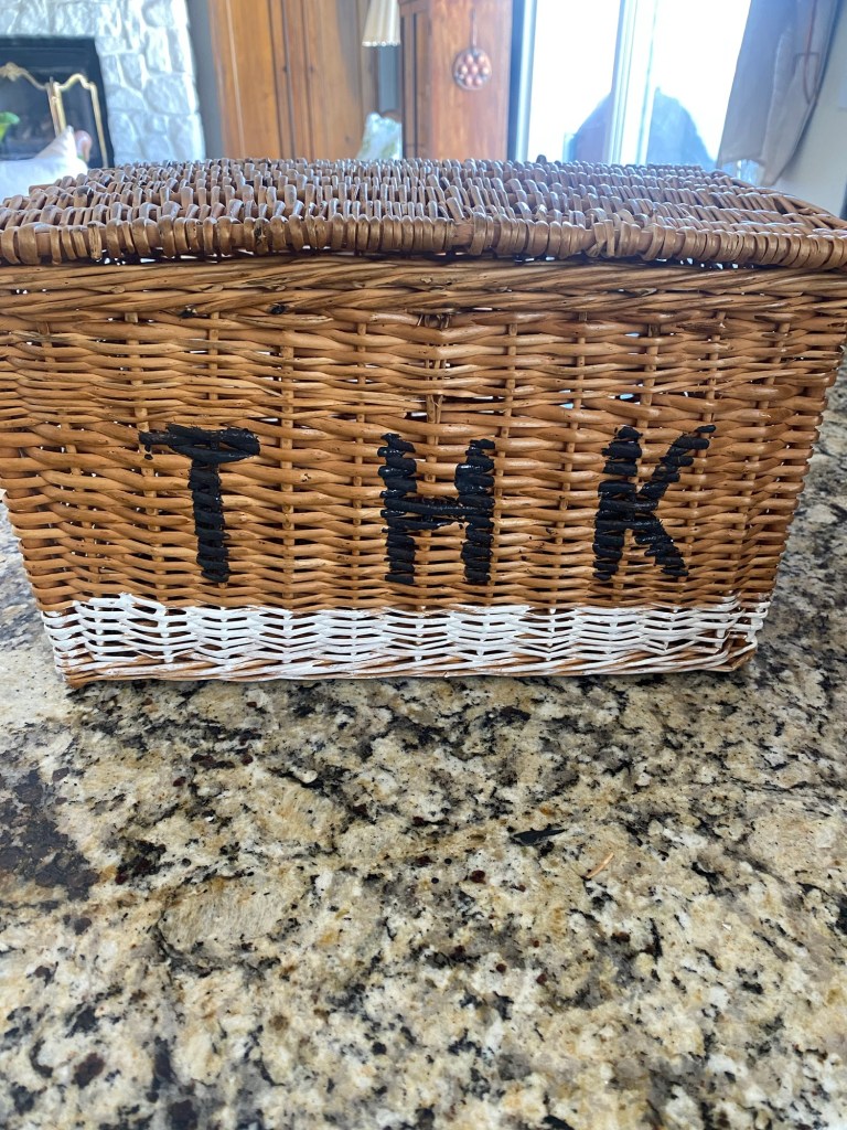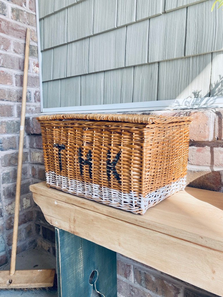 I thrifted this little basket last week… It reminded me of my basket I got from France. Sooo I stenciled some letters on it 🤍 What do you think? #stencil #basket #remake #canitpass #thrifted #repurposed #handmedowncottage #furnitureattiffanys