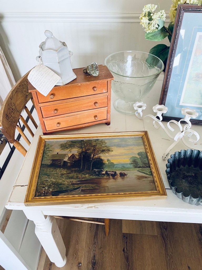 Today’s thrift haul… actually a couple things are from @treasuresspringvilleutah and #marketplace 🤍 But 95% are thrifted! What would be your fav? Mine is the tiny dresser #thrifted #deseretindustries #antiques #vintage #indianaglass #thursday #thriftstorefinds #handmedowncottage #furnitureattiffanys