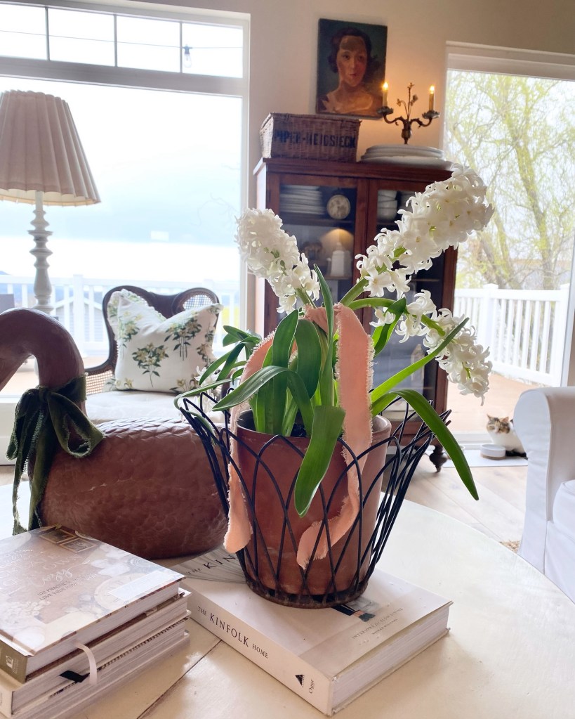 Happy April 🤍🪻 Does anyone else have to tie up their hyacinths? And how cute in my photo bomber 😻 #steviethegirlkitty #hyacinth #floppy #april #homedecor #coffeetable #handmedowncottage #furnitureattiffanys