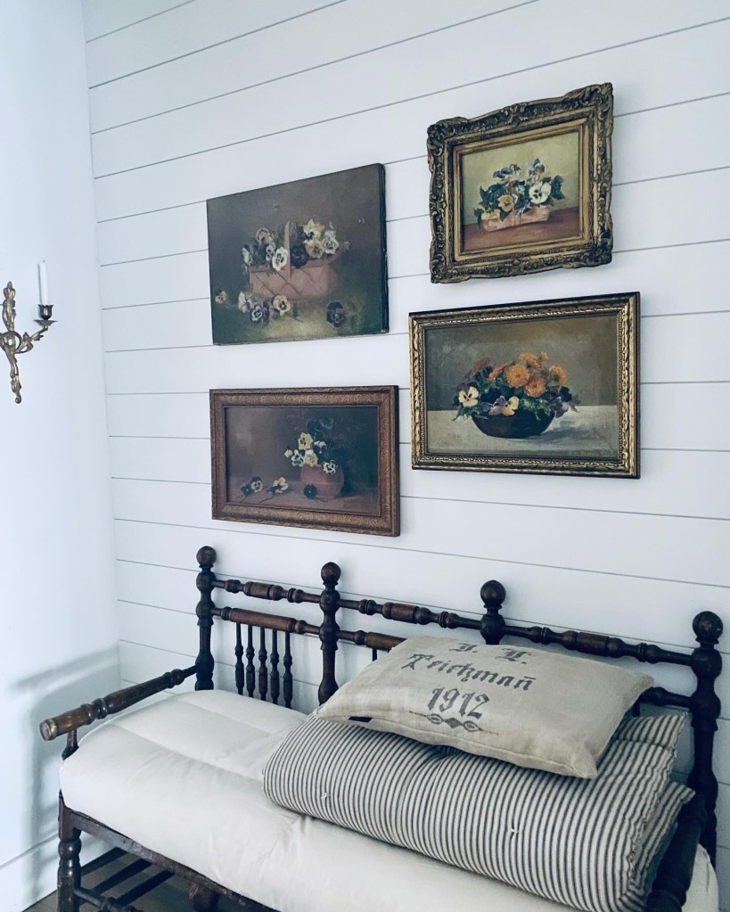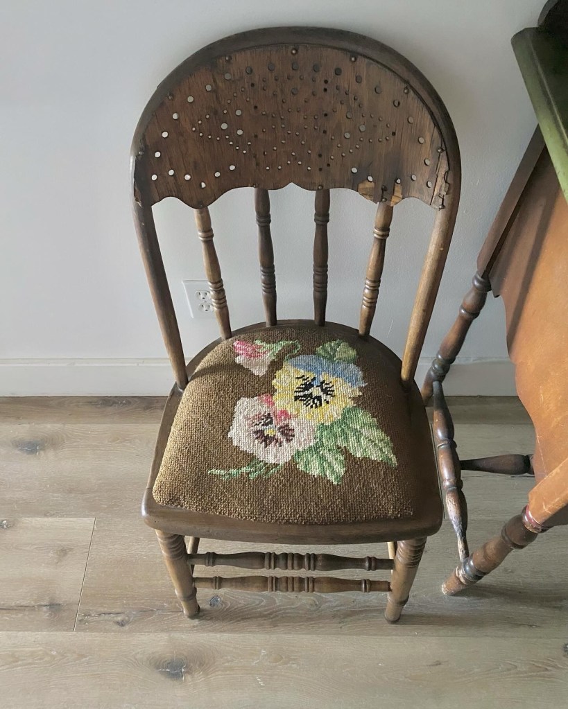I found the PERFECT chair for my entryway… Pansy needlepoint seat 💕 Matches my Pansy painting perfectly #antiquechair #pansy #paintings #entrywaydecor #needlepoint #old #perfect #handmedowncottage #furnitureattiffanys