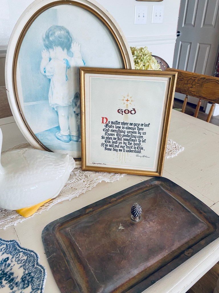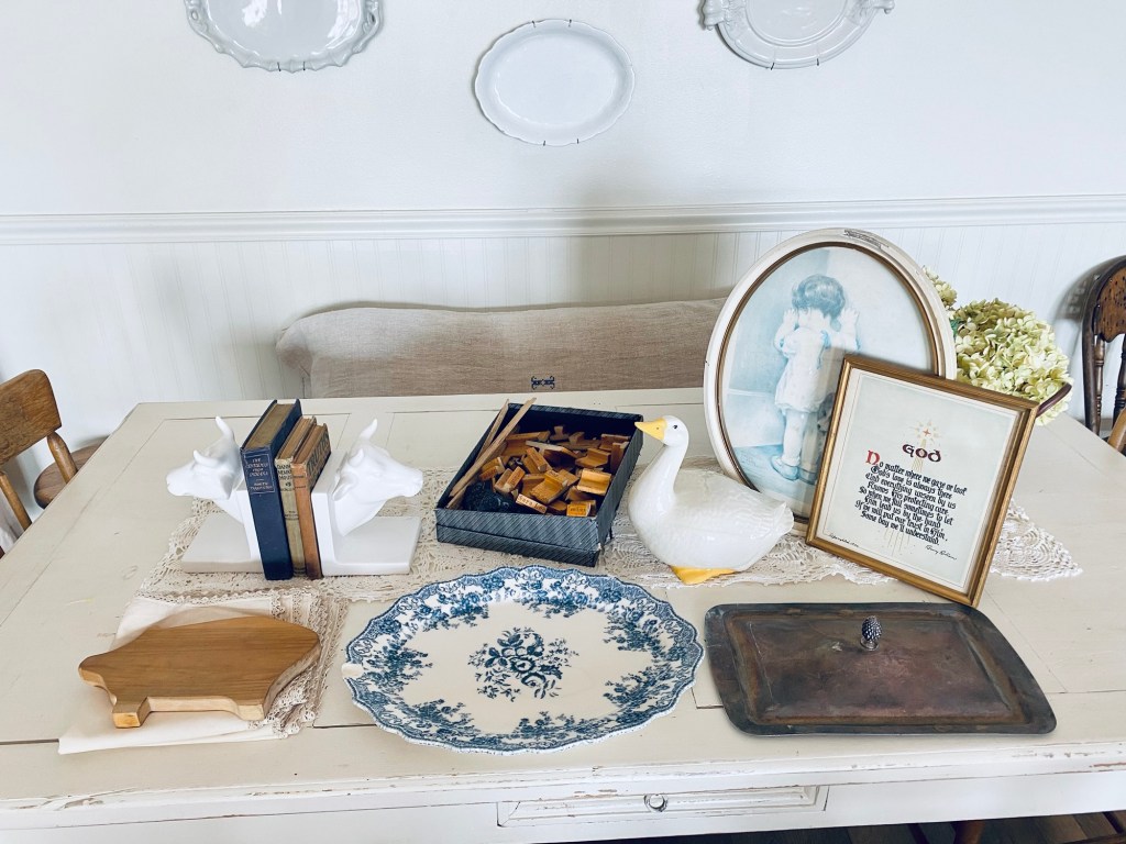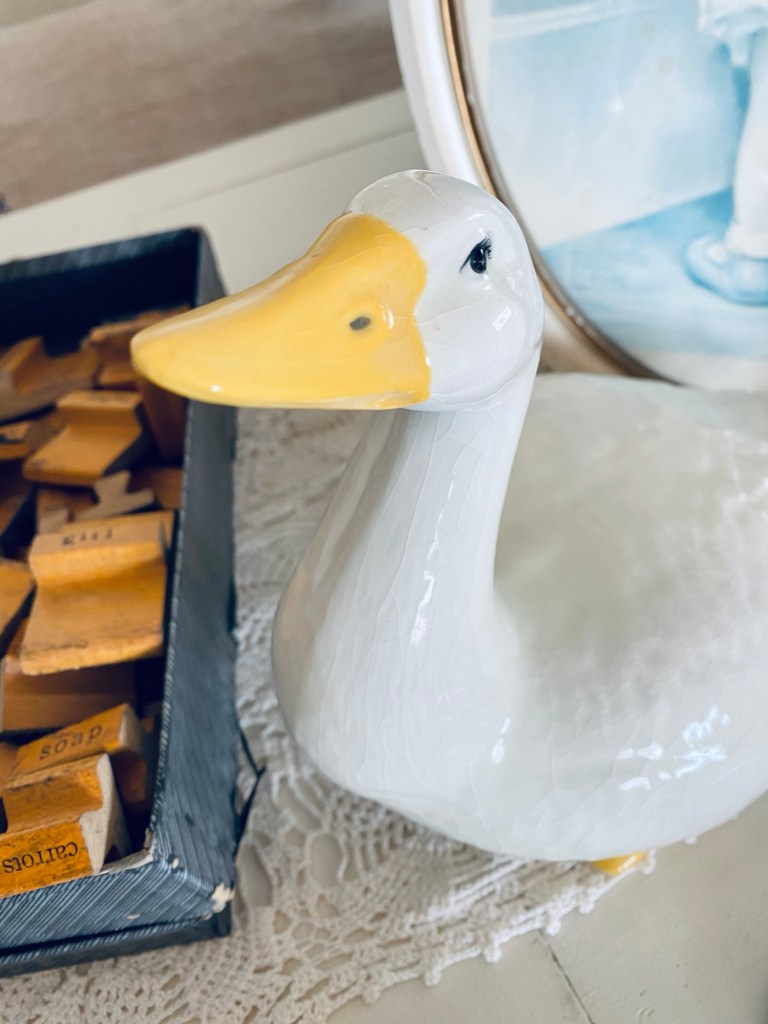 My thrifty finds today 🤍 That sweet duck was seriously staring up at me begging to take her home 🤍 What would be your fav? It’s a tie for me between the vintage stamp set and of course the duck! #thriftstorefinds #deseretindustries #vintage #stamps #duck #hadtogiveherahome #antiquebooks #handmedowncottage #furnitureattiffanys