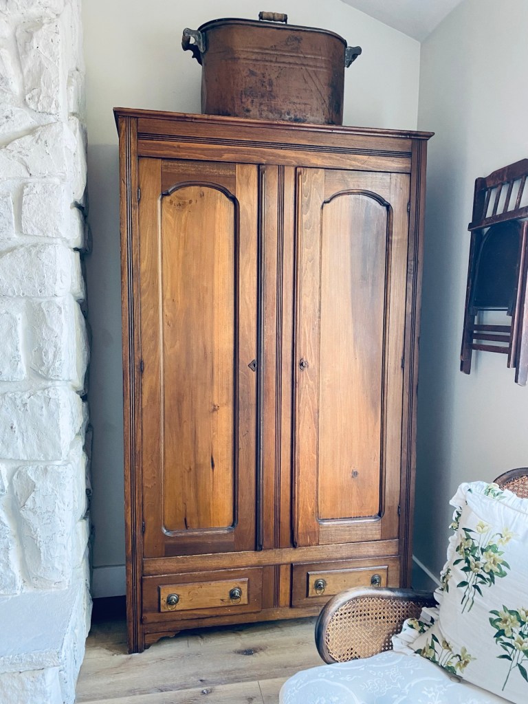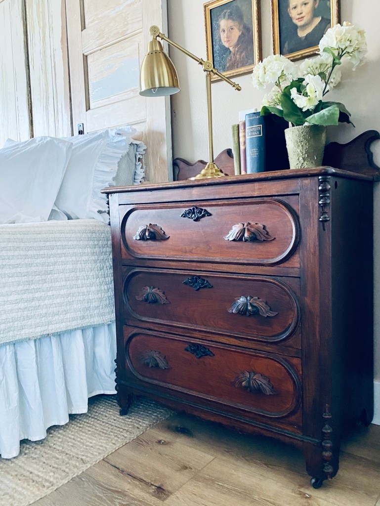 I know it’s popular right now to bleach your furniture… I think I will keep mine the original dark finish 🤍 #antiquefurniture #dark #original #bleach #trends #comeandgo #timeless #handmedowncottage #furnitureattiffanys