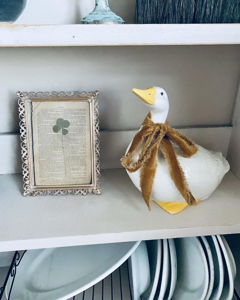This sweet duck was just begging me to take her home from #deseretindustries the other day… I think she’s happy now 🤍 #thrifted #styled #home #vintage #duck #sweet #adopted #loveher #bow #happy #handmedowncottage #furnitureattiffanys