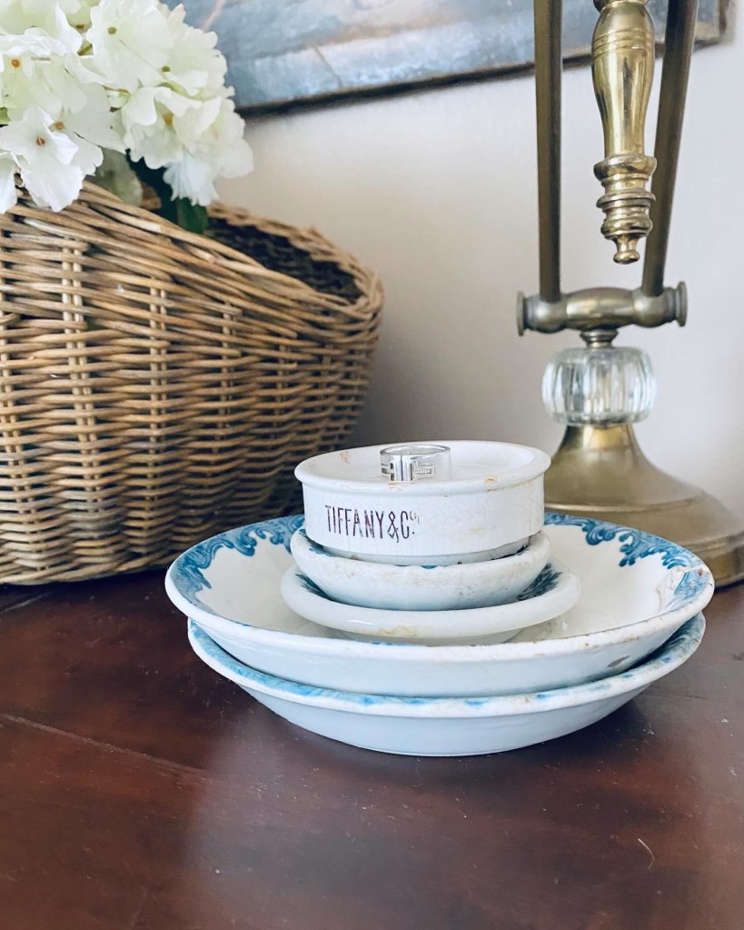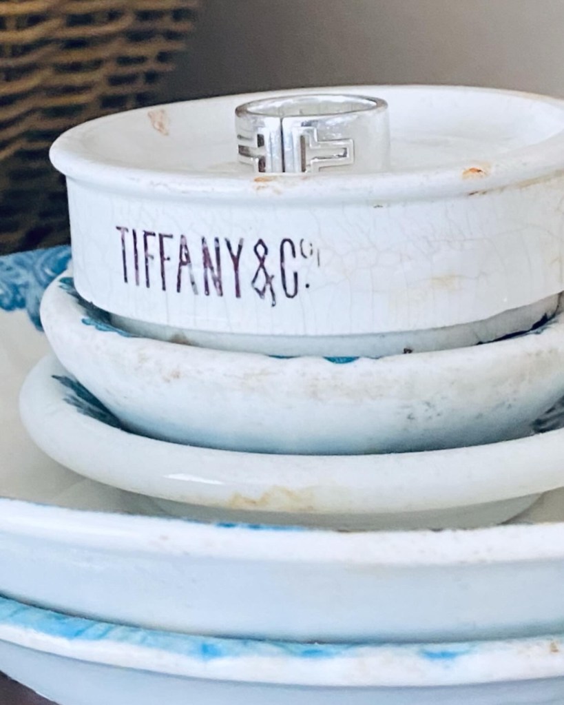 How cute is this? And Tiffany’s? Perfect for me 🤍🩵 Thank you Fairy Dust and Rust! I adore it! #tiffanys #fairydustandrust #ironstone #happymail #perfectringholder #happymonday #handmedowncottage #furnitureattiffanys