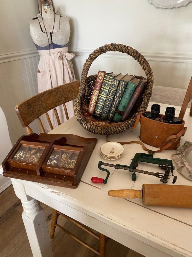 Today small thrift haul 🩷 What would be your fav? Can you guess mine?? #thrifthaul #smallhaul #thriftstorefinds #deseretindustries #saversthriftstore #vintage #oldbooks #antiquedollhighchair #butterpats #vintagebonoculars #handmedowncottage #furnitureattiffanys