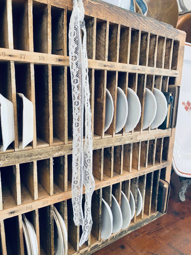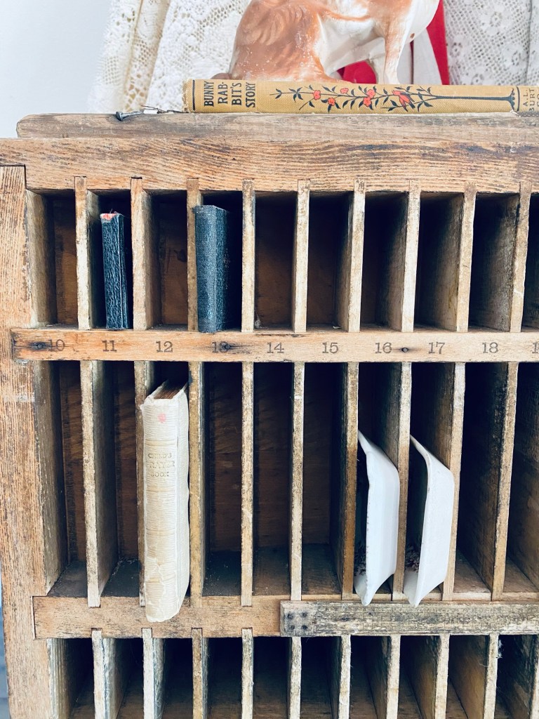 Here is the antique letterpress holder I picked up from @bramblesandblossomsprovo yesterday styled 🤍 It’s perfect for holding mini antique books and butter pats 🤍🤍 #butterpats #minibibles #tinybooks #letterpress #antique #handmedowncottage #furnitureattiffanys