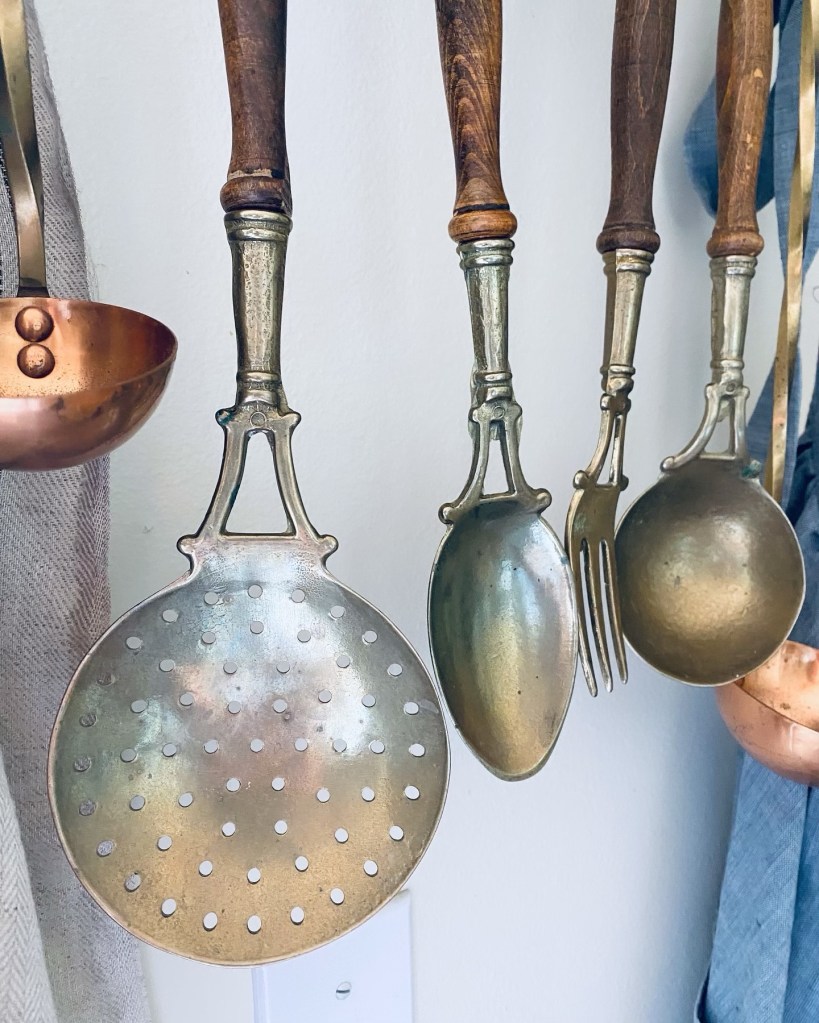 How gorgeous are these vintage french serving pieces I found on #marketplace 🤍 I love them! Any tips on getting them to hang more level? There’s no holes to hang them, so I’ve used some twine 🤍 Also… scroll to the last pic! Im selling my antique blue onion set! Message me if you’re interested 💙🤍💙 #french #kitchendecor #antique #brass #wood #cooking #handmedowncottage #furnitureattiffanys