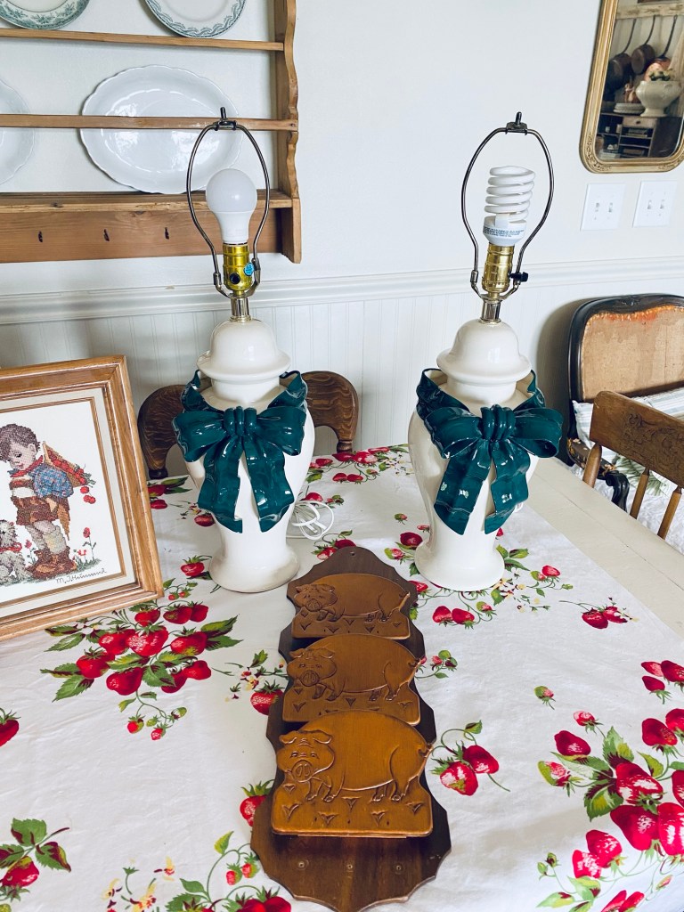 I ran into a couple thrift stores today… this is what I found 🤍 What would be your fav? I adore those bow lamps 🎀🎀 #hummel #crossstitch #vintageframes #bows #lamps #thriftstorefinds #deseretindustries #saturday #handmedowncottage #furnitureattiffanys