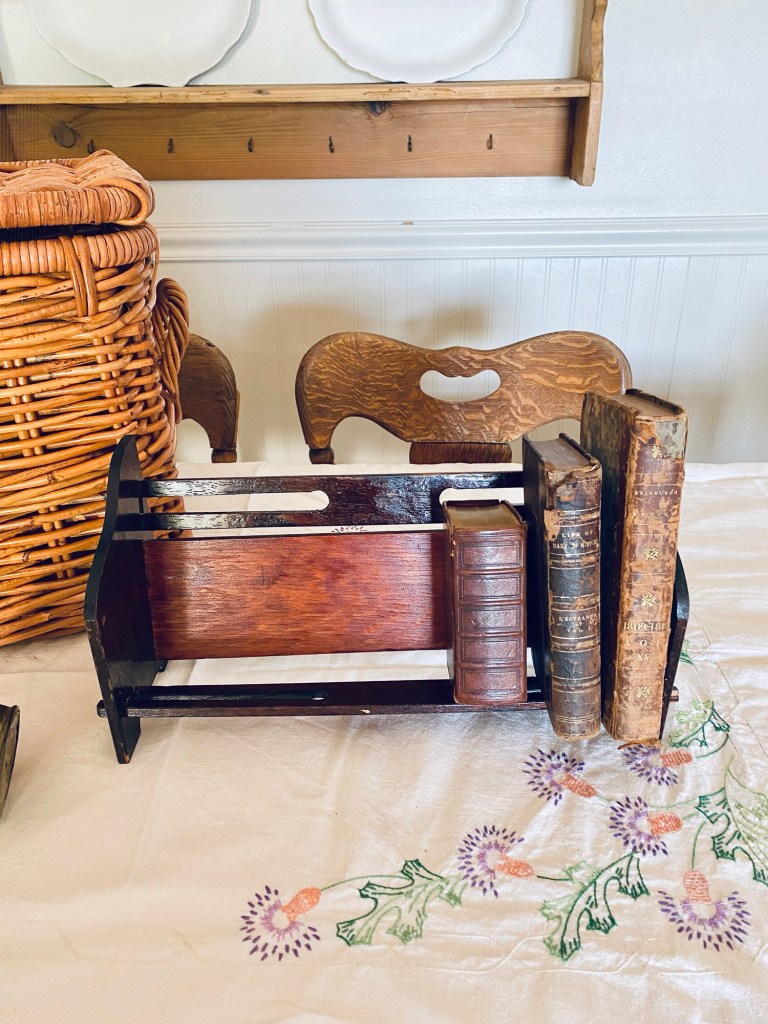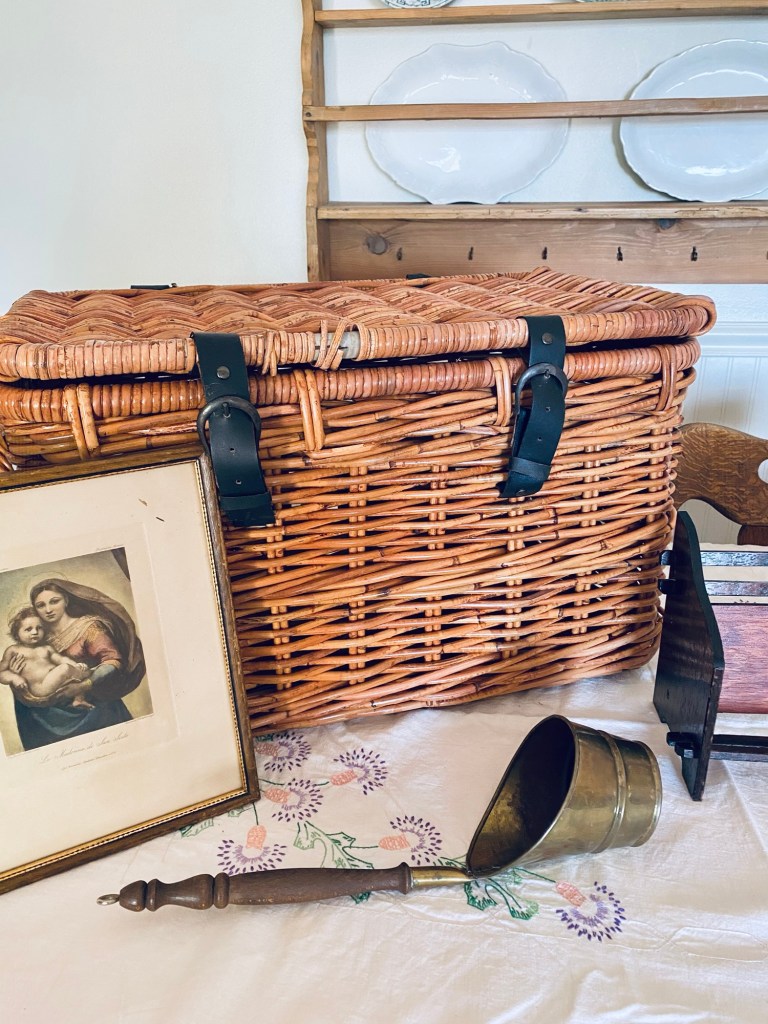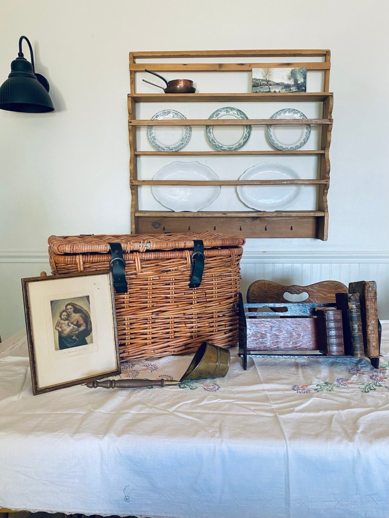 Sometimes you only find a few things while thrifting… but sometimes the small hauls are the best hauls 🤍 What would be your fav? Mine is the old Mary and Jesus print 🤍🤍🤍 #thrifting #yardsale #vintage #basket #art #bookholder #brass #kitchen #smallhaul #saturday #handmedowncottage #furnitureattiffanys