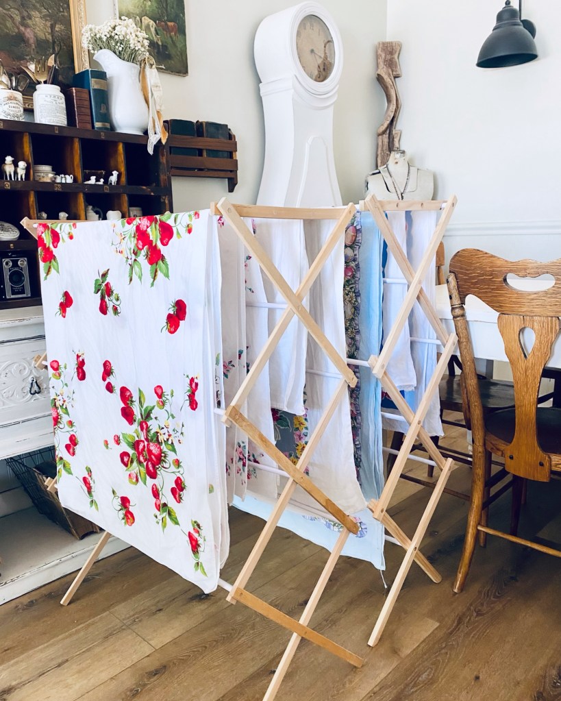 Table linens are washed and hung to dry ❤️ That’s a wrap for my Fall vintage sale! Thank you to all who came and chatted, shopped and supported my little business! And thank you for the prayers for good weather! It was a lovely 3 days! Time to start collecting for my next sale ❤️ #vintagesale #homedecor #antiques #fall #linens #vintagelinens #stawberry #myfeethurt #friendship #thankyou #handmedowncottage #furnitureattiffanys