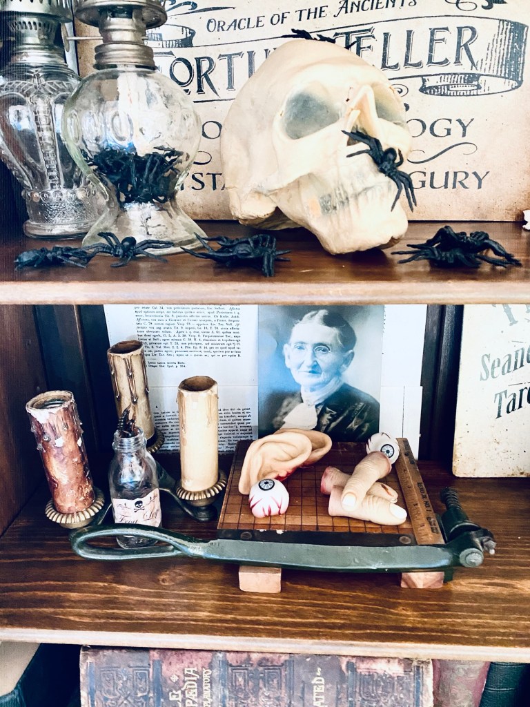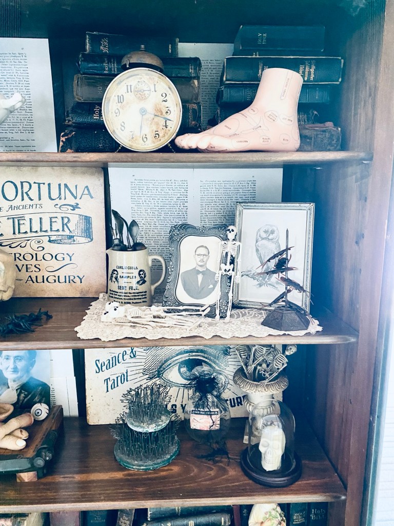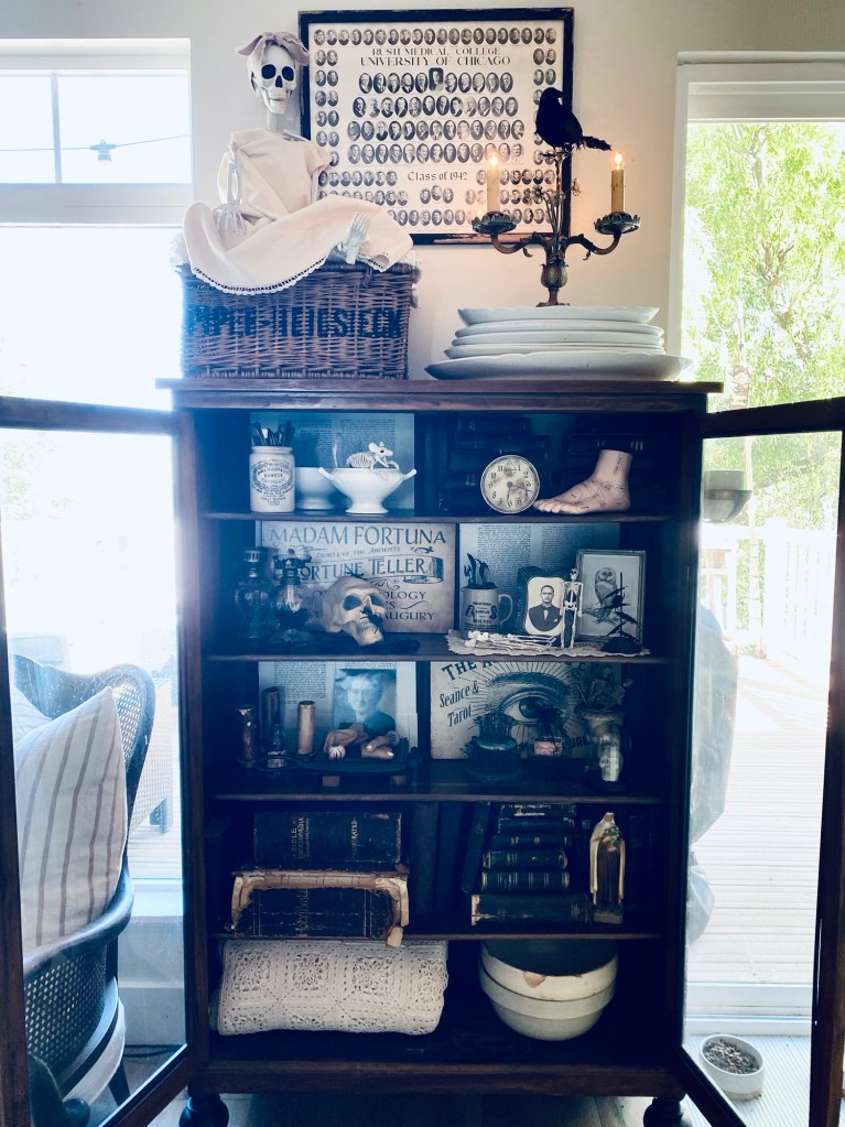 Every year I do a “witches cabinet” for Halloween 🖤🖤🖤 It’s fun to create something a little different every year! Im sure I will play around and change this multiple times before the Oct 31st 🖤 Do you decorate for Halloween? #halloween #halloweendecor #witchescabinet #skeleton #blackandwhitephotography #vintagehalloween #homedecor #furnitureattiffanys #handmedowncottage #vintage #thriftstorefinds #antique #ironstone