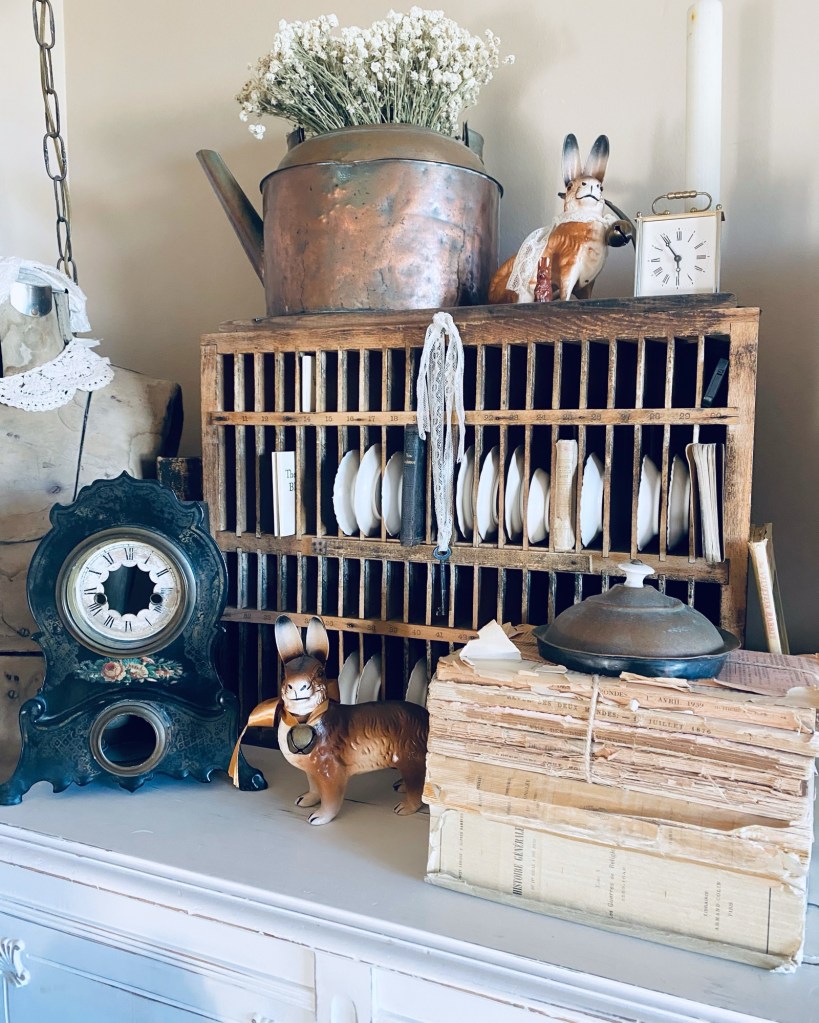 Happy Friday 🤍 #roomview #furnitureattiffanys #handmedowncottage #vintage #antiques #bunnies #cubbies #butterpats #frenchbooks