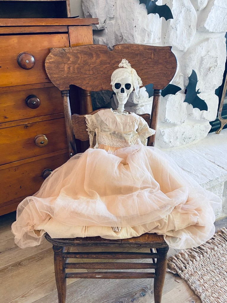A little skeleton all dressed up 🤍 #halloween #skeleton #thrifteddress #glam #isntshesweet #happysaturday #antiquefurniture #homedecor #vintagehalloween #vintagehalloweendecorations #furnitureattiffanys #handmedowncottage #vintage #thriftstorefinds #antique #homedecor