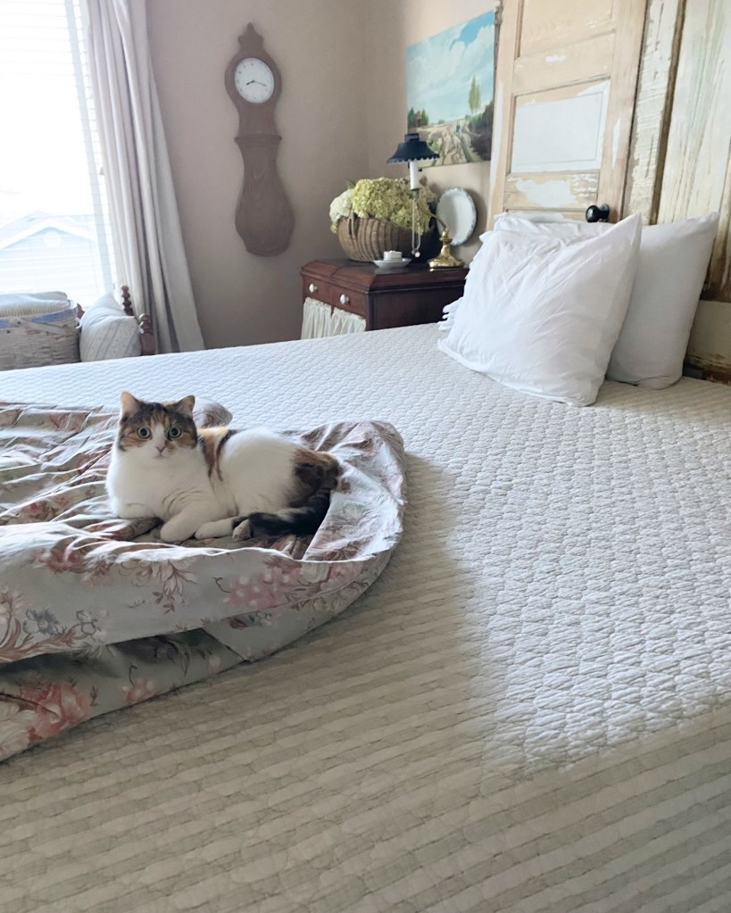 Trying to make my bed around a cat who wonโt move ๐ ๐ค #sillycat #sherefusestomove #comfy #cats #catsofinstagram #steviethegirlkitty #wednesday #handmedowncottage #furnitureattiffanys