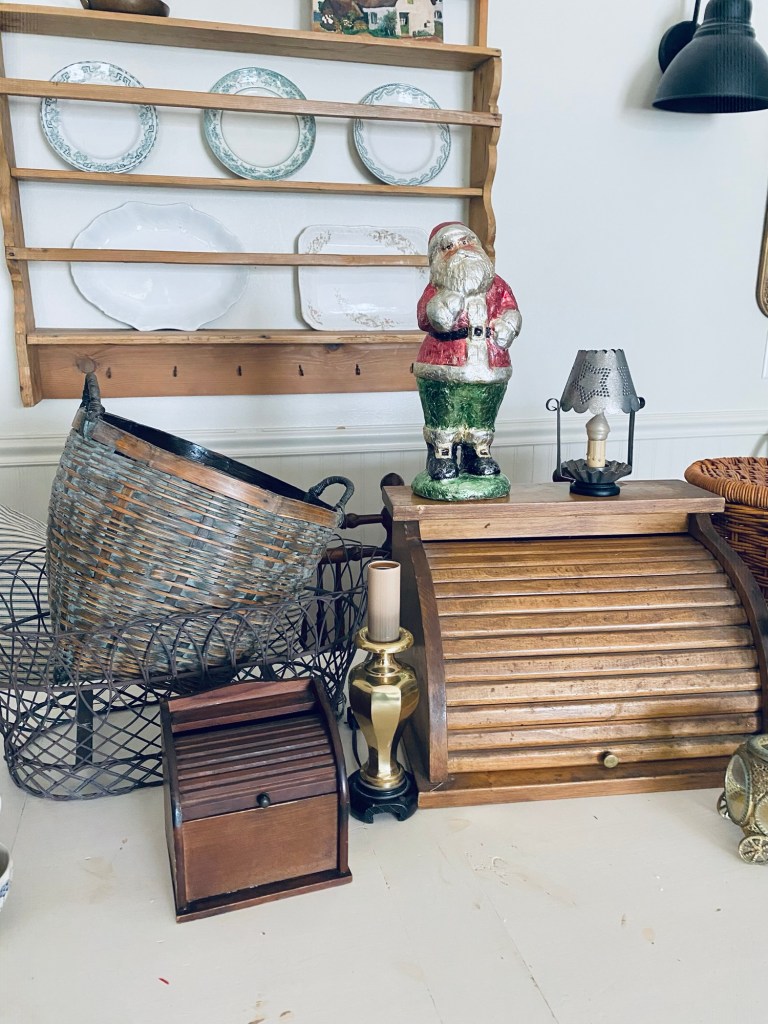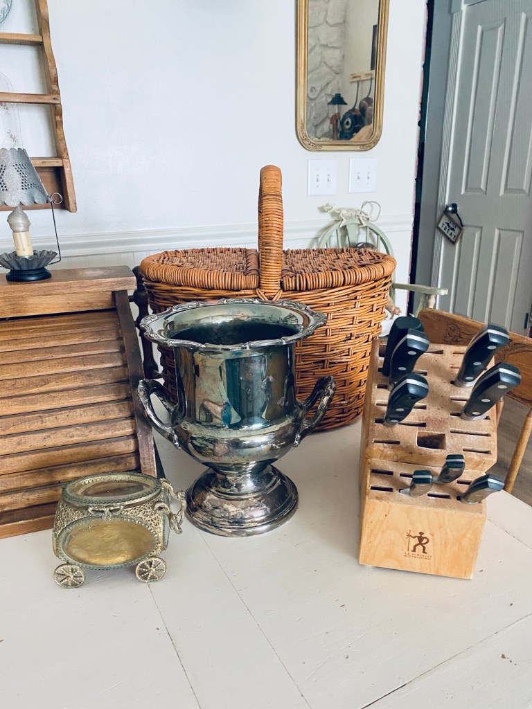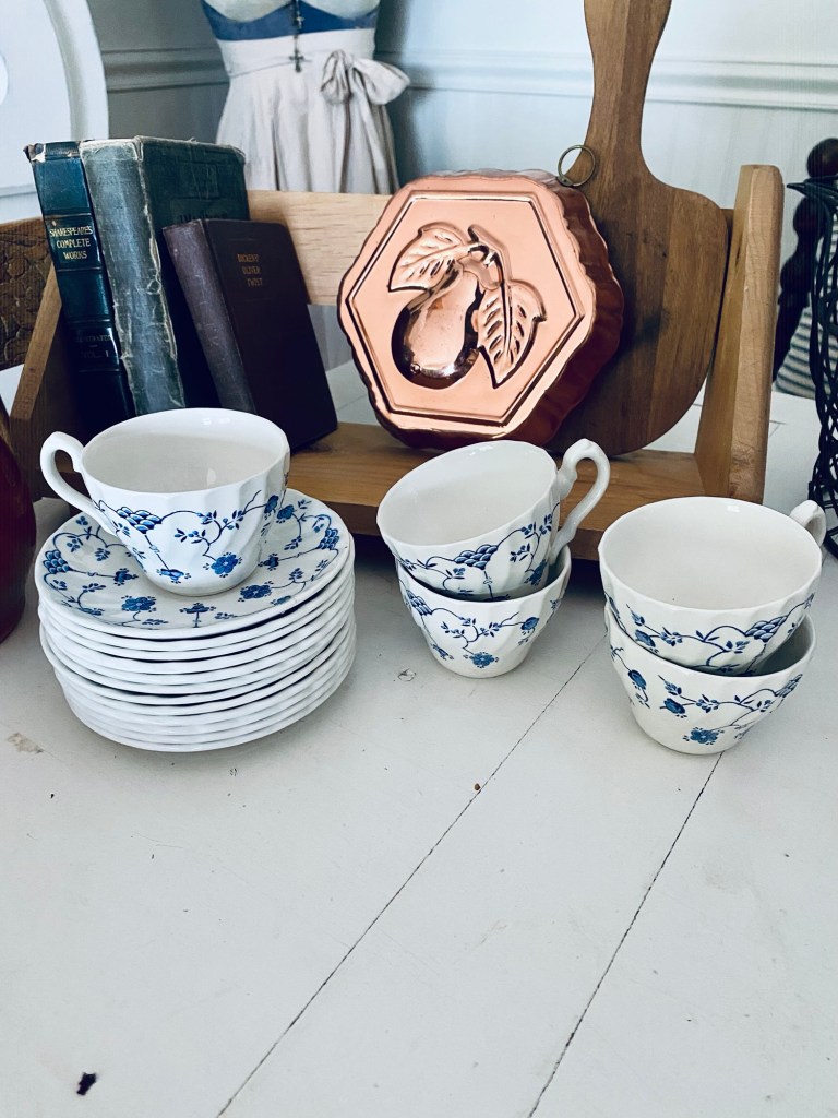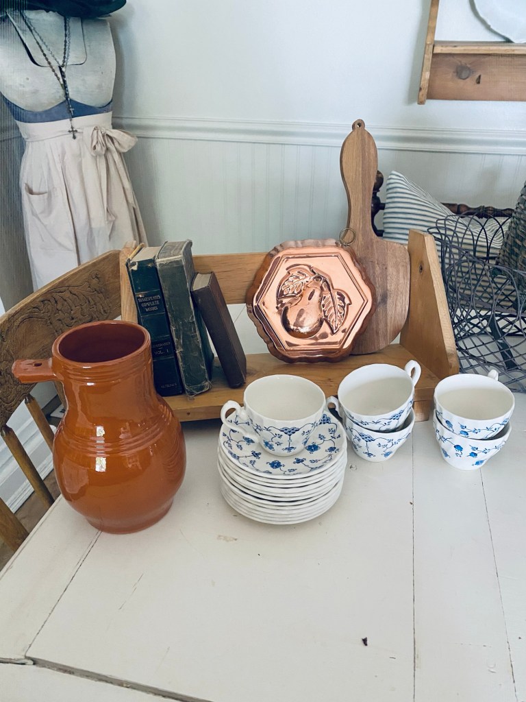 Todays finds 🤍🤍🤍 What would be your fav? Mine are the antique books! #furnitureattiffanys #handmedowncottage #vintage #homedecor #antique #thriftstorefinds #deseretindustries #thrifting #ironstone #blueonion #baskets