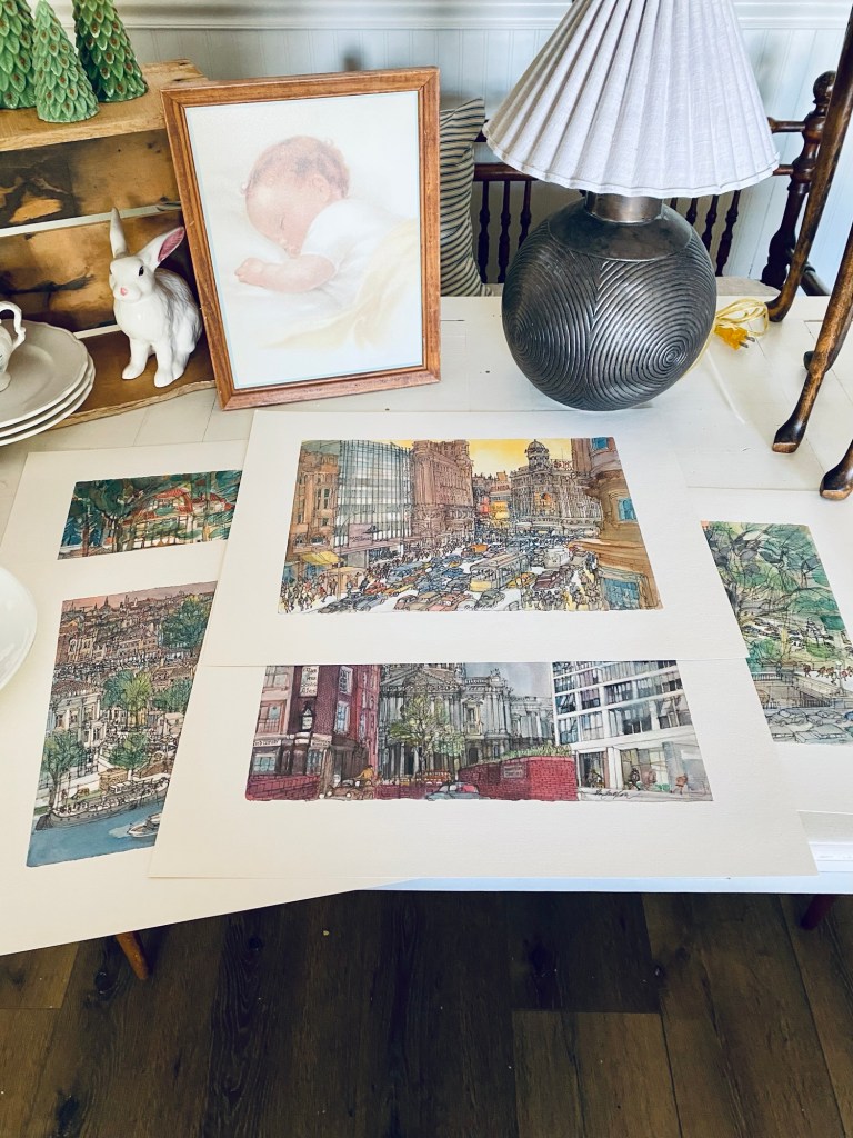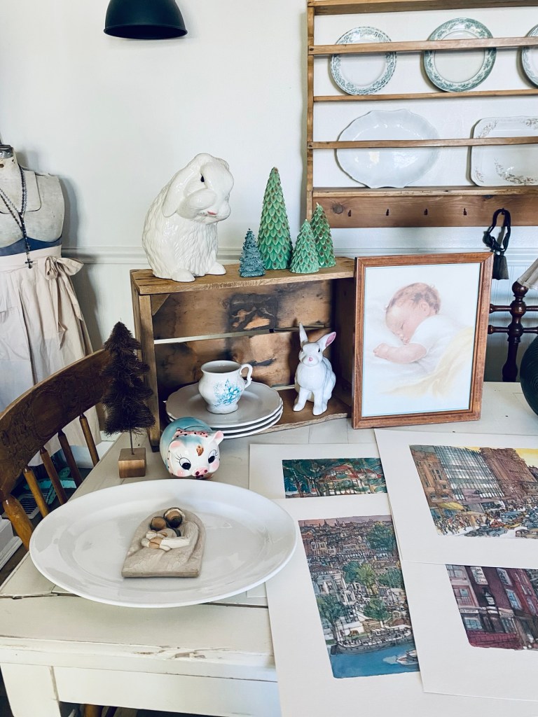 Today’s finds 🤍 What would be your fav? Mine are the European water color prints! And Leah’s fav is the #goldengirls mug! #furnitureattiffanys #handmedowncottage #vintage #homedecor #antique #thriftstorefinds #art #deseretindustries #ironstone #thrifting #bunnies