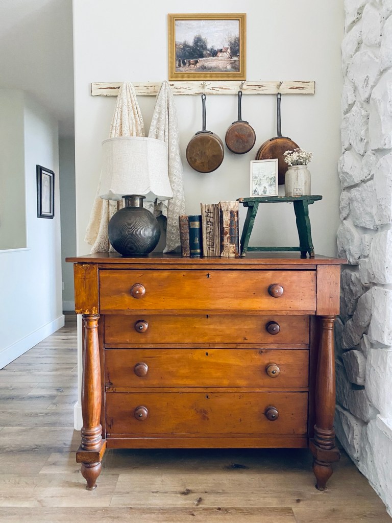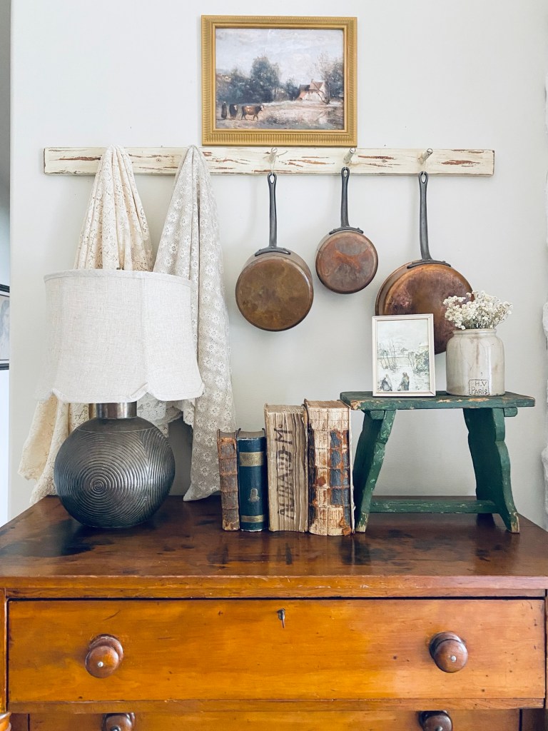 I did a little refresh on my dresser top today 🤍 What do you think? #refresh #furnitureattiffanys #handmedowncottage #vintage #homedecor #antique #thriftstorefinds #art #collected #antiquebooks #thriftedlamp #home