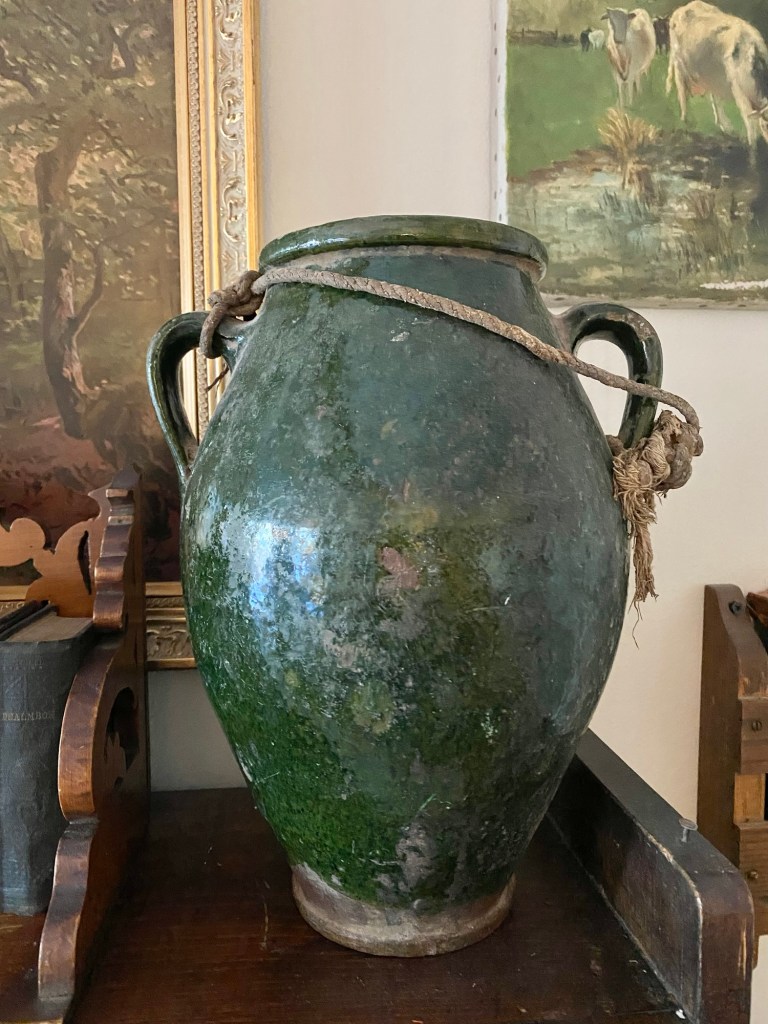 One of my best thrift finds 🤍🍂 Antique olive jar. It still has the rope on it! Super old and super cool! What is one of your favorite items you’ve thrifted? #thriftfinds #antique #olivejar #old #european #green #rope #alloriginal #handmedowncottage #furnitureattiffanys