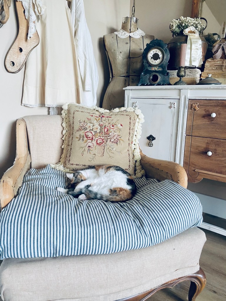 Good morning 🤍 Friday already! #steviethegirlkitty is having a hard time waking up 🤍 #friday #cats #catsofinstagram #sleepy #home #cozy #handmedowncottage #furnitureattiffanys
