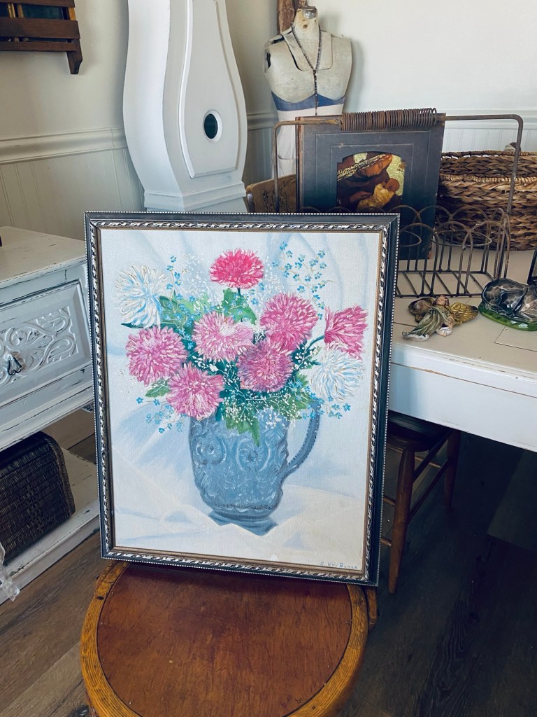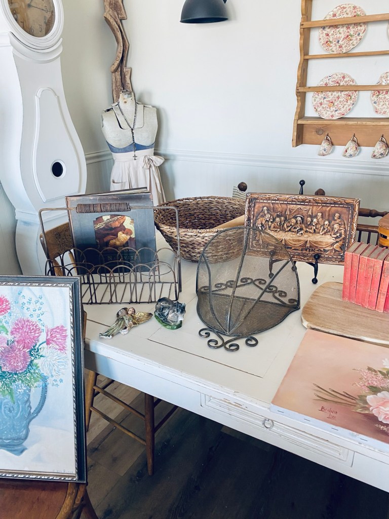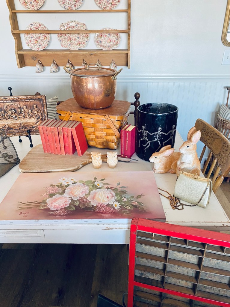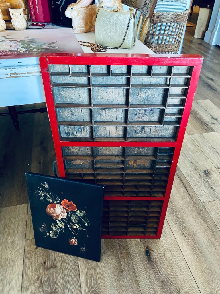 Todays finds ❤️ What would be your fav? I’m loving the copper pot! That typeset drawer is 😍 too #furnitureattiffanys #handmedowncottage #vintage #homedecor #antique #thriftstorefinds #art #thrifting #thrift #deseretindustries #painting #floral #typesetdrawer #red #copperpotsandpans