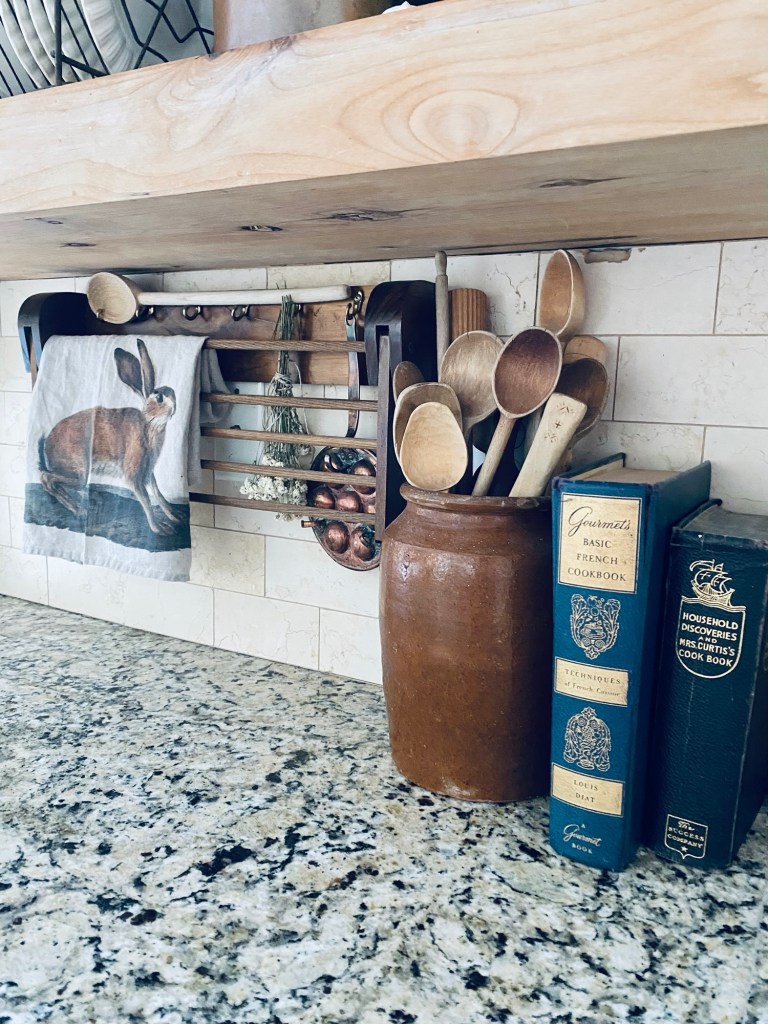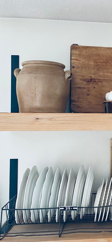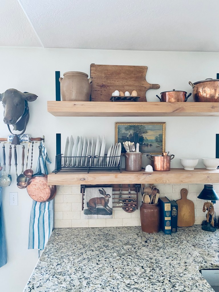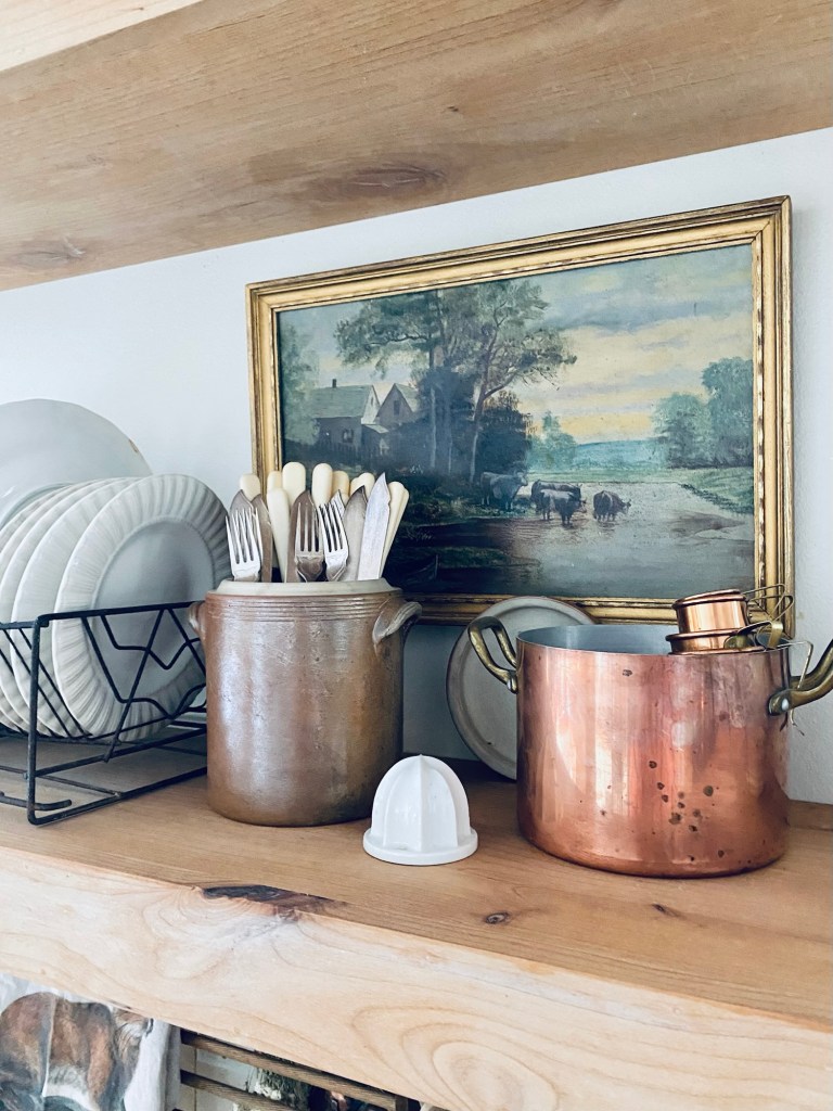 Just some kitchen views today 🤍 I’ve been collecting some French antique kitchen items for years now… it’s fun to see it start to come together 🤍 #furnitureattiffanys #handmedowncottage #vintage #homedecor #antique #thriftstorefinds #art #ironstone #copperpots #frenchkitchendecor #frenchstoneware