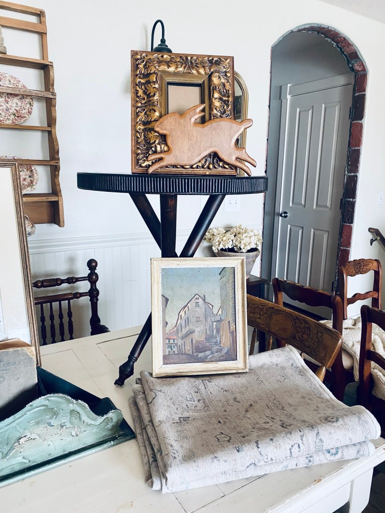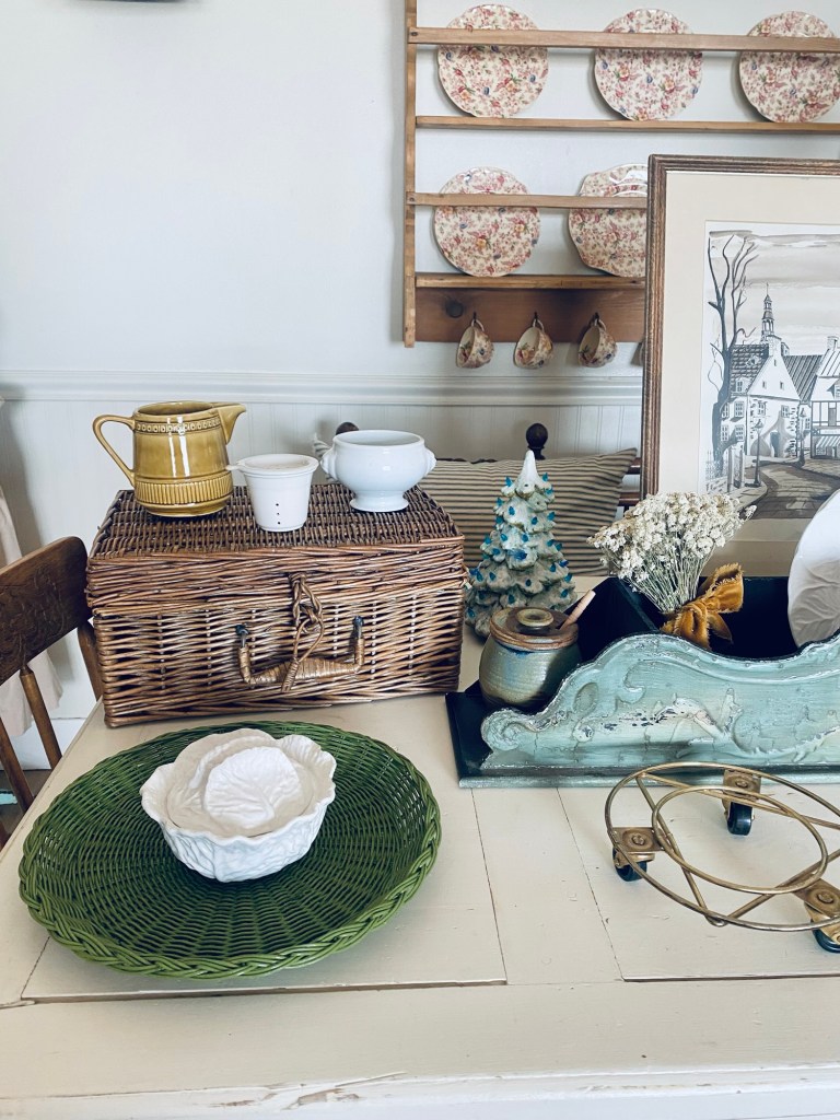 Todays finds 🤍 What would be your fav? Of course the #art 🤍 But I adore the little #cabbageware lidded pot! #furnitureattiffanys #handmedowncottage #vintage #homedecor #antique #thriftstorefinds #thrifting #deseretindustries #ironstone #baskets