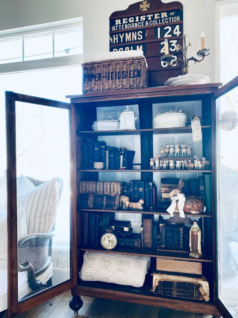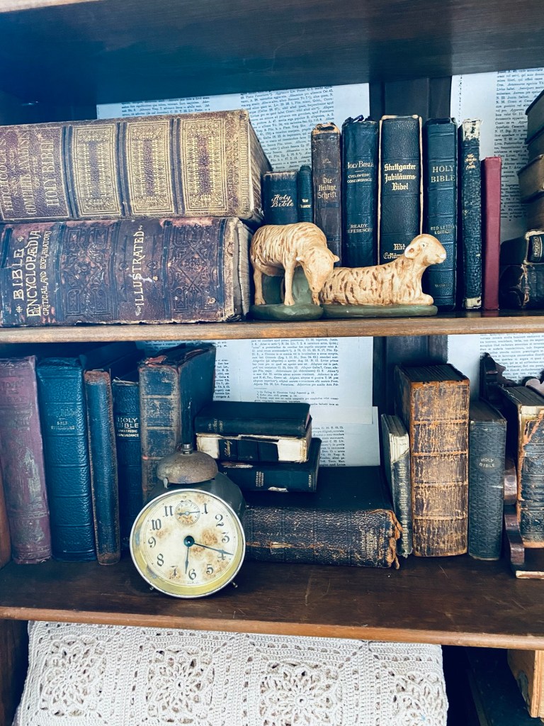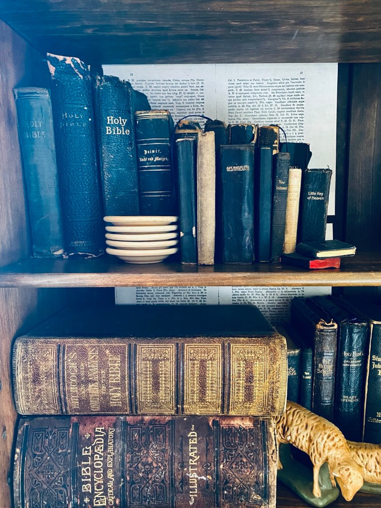 Happy Sunday 🤍 I moved all of my antique Bibles and hymnals in my collection to my glass cabinet… with the exception of one 🤍 She sits proudly on my coffee table on top of some antique books 🤍 What are some things that you collect? I’d love to see how you display them! #furnitureattiffanys #handmedowncottage #vintage #homedecor #antique #thriftstorefinds #ironstone #hymnboard #antiquebibles #bible #sunday #collection #display