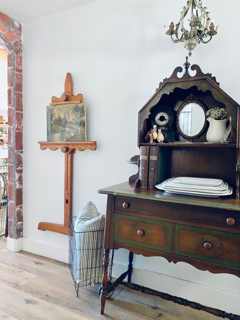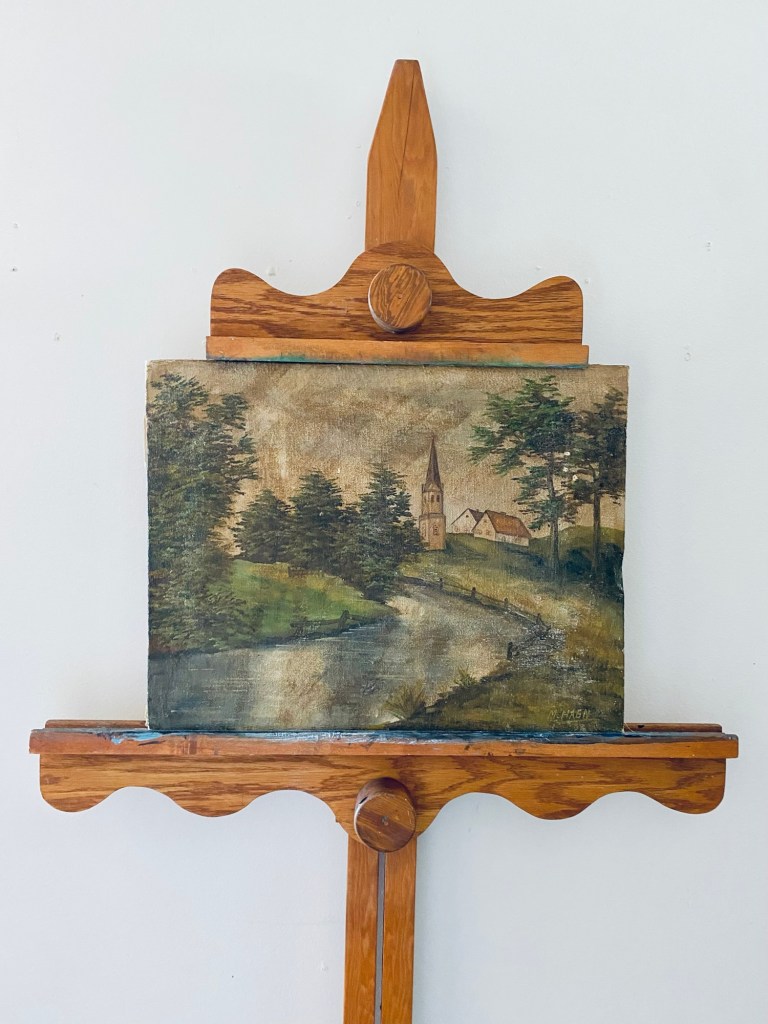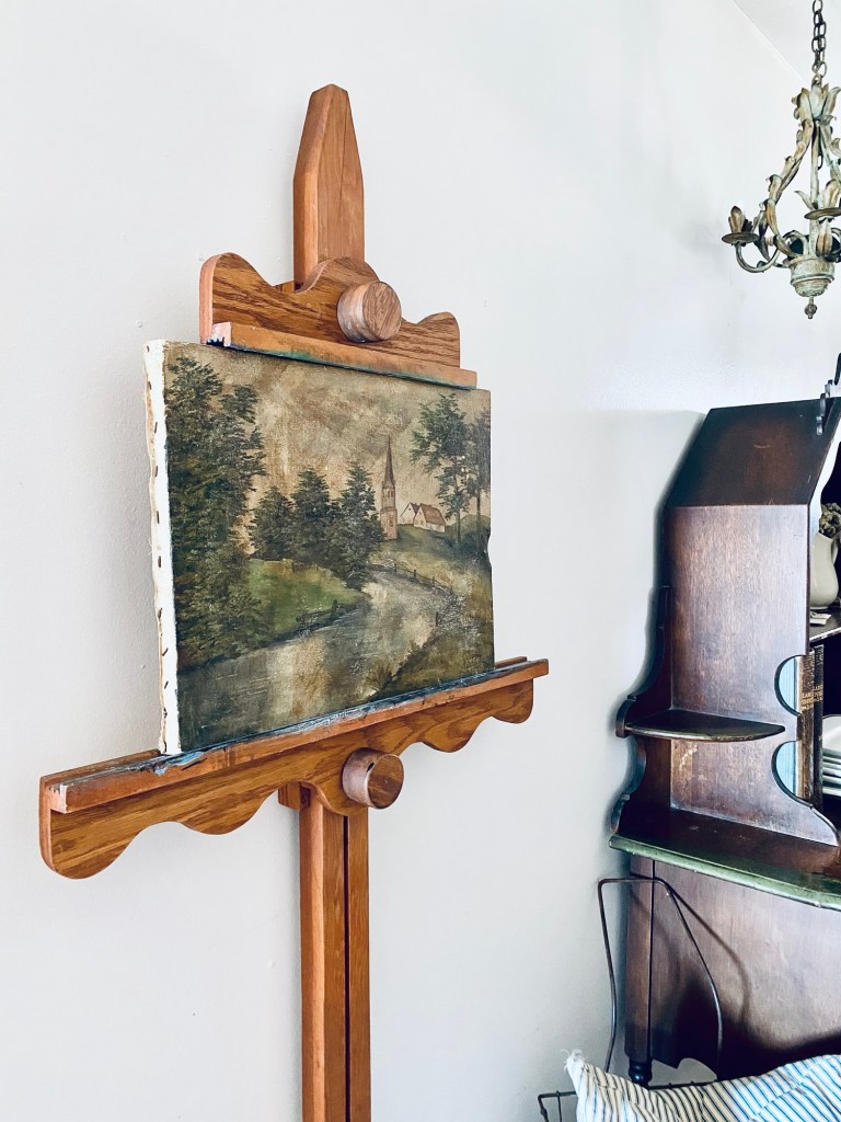 My aunt gave me her old art easel a couple of years ago 🤍 I’ve been trying to decide what to do with it! I put it on this wall and it felt short. Sooo I decided to hang it up on the wall! I mean, why not make the easel part of the art right? Ha! Is it too weird? What are your thoughts? I’m kinda liking it 🤍 #furnitureattiffanys #handmedowncottage #homedecor #vintage #antique #art #easel #family #loveit #hangitup #antiqueart #oilpainting #french