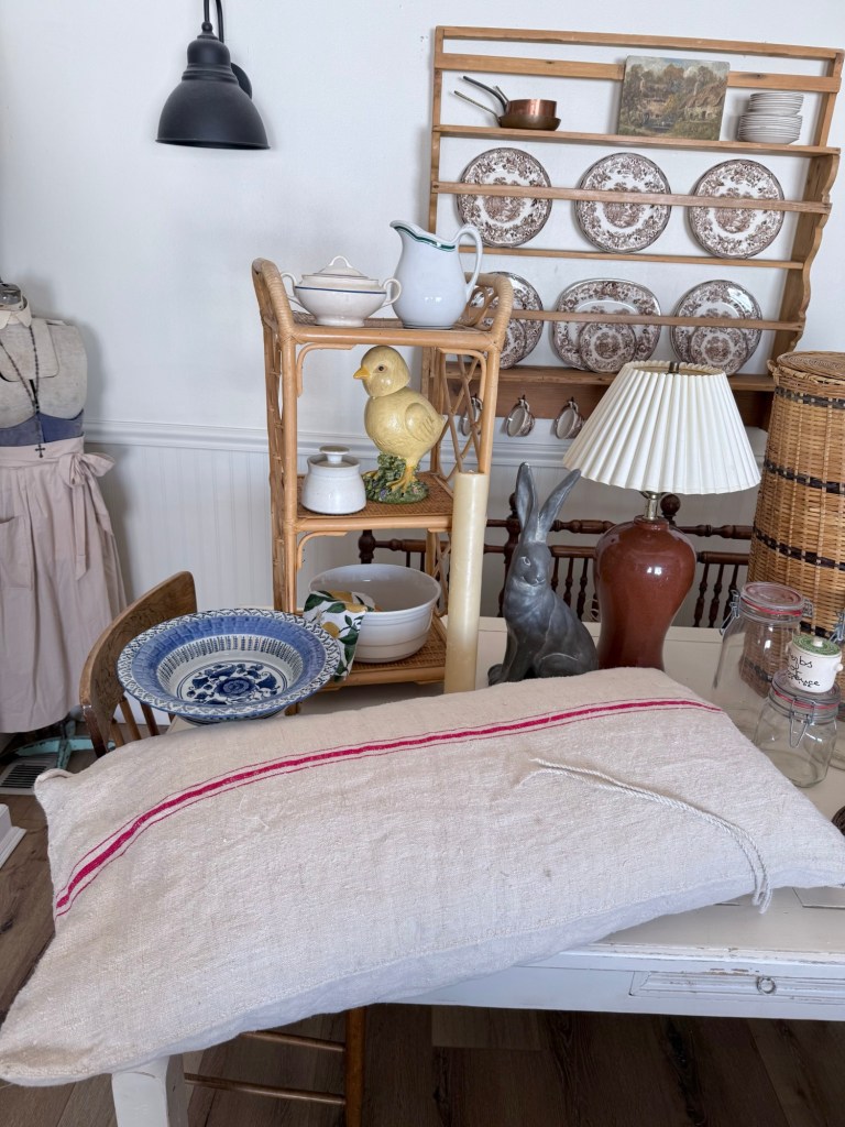 Todays finds! What would be your fav? Mine is the bobble head chick 💛🐥 #furnitureattiffanys #handmedowncottage #homedecor #vintage #antique #thriftstorefinds #thrifting #deseretindustries #ironstone #vintagelamp #basket #bunny #chick #spring #blueandwhite #frenchgrainsack #copper