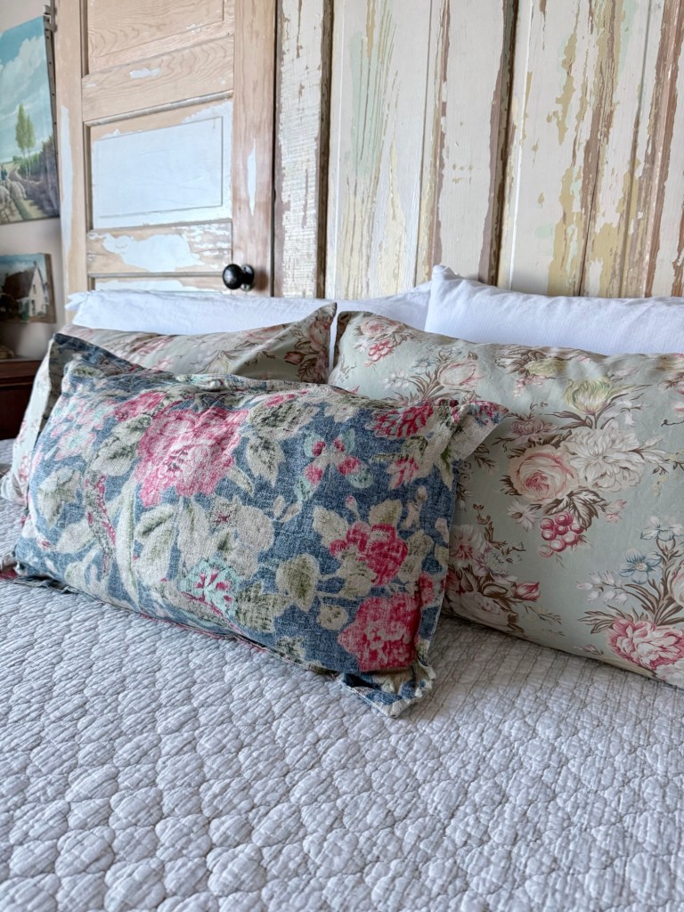 Do you like different floral patterns together, even if they don’t match perfectly? I think I do 🌷🩷 All thrifted ( and washed ) haha! #furnitureattiffanys #handmedowncottage #homedecor #vintage #thriftstorefinds #florals #floralbedding #stripes #thrifted #washed #floralpillows #mixandmatch