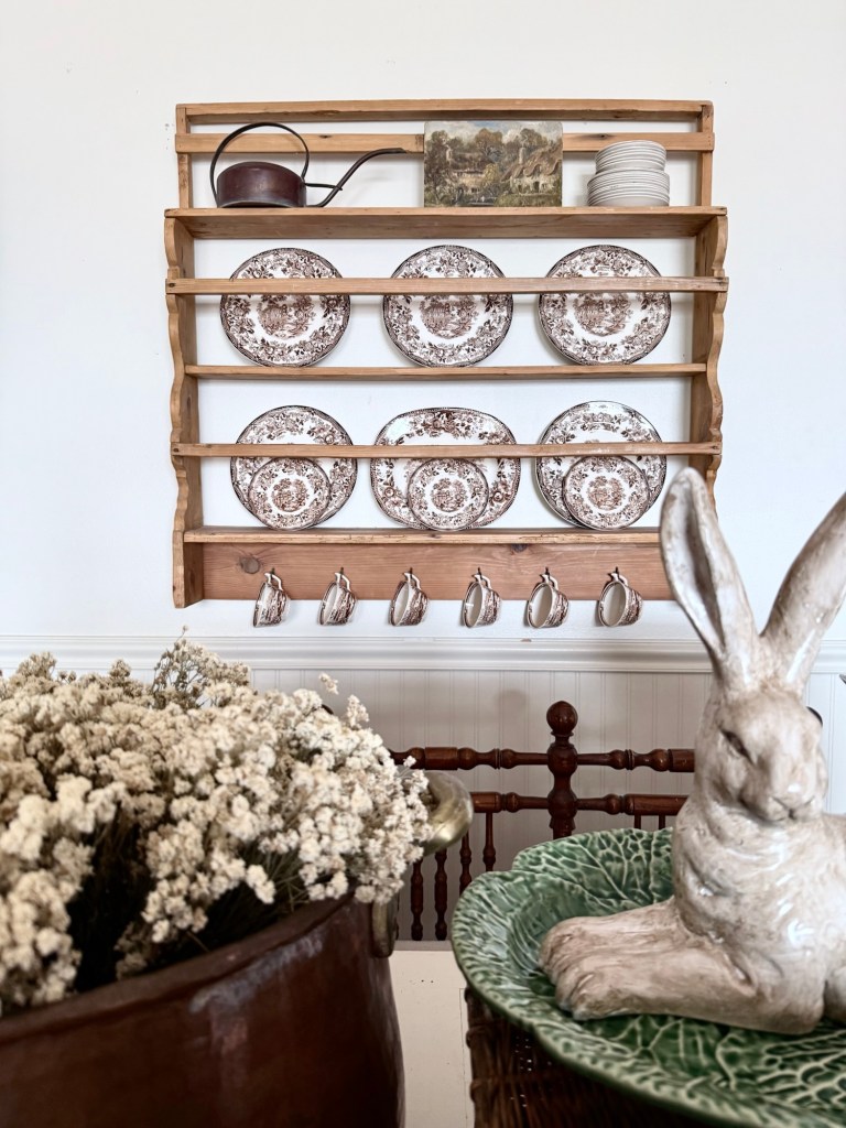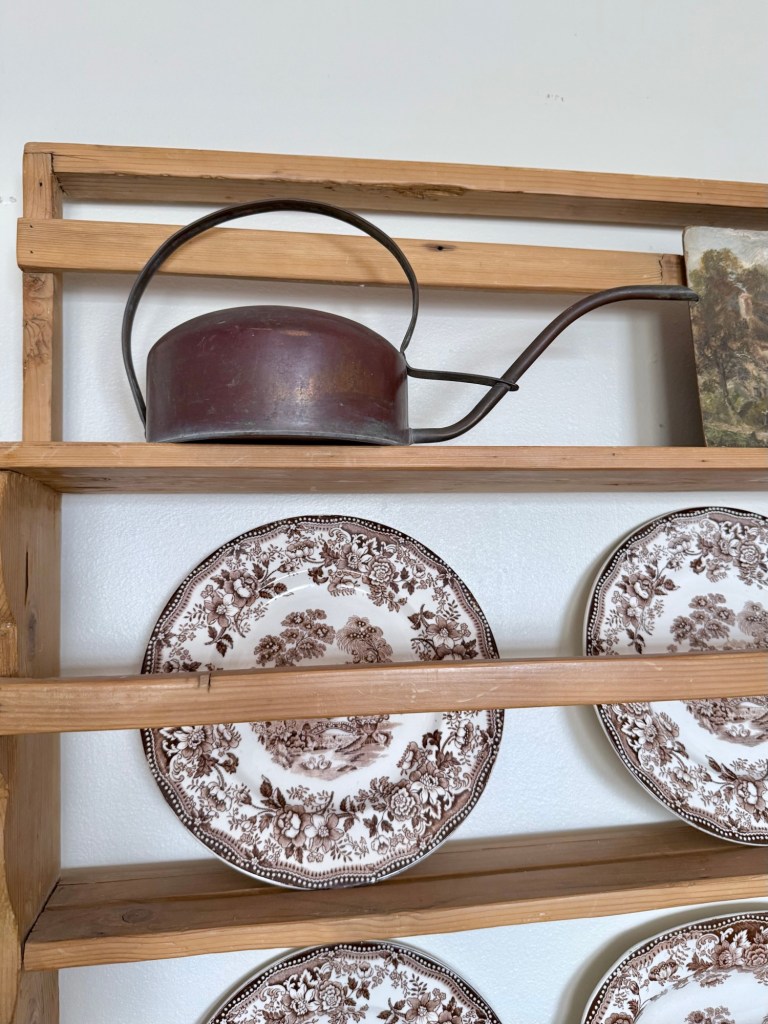 I found this sweet antique watering can @bramblesandblossomsprovo yesterday 🤍 I always find the most amazing things there! Thanks Lisa 🤍 #furnitureattiffanys #handmedowncottage #homedecor #antique #wateringcan #copper #antiquing #platerack #dishes #transferware #art