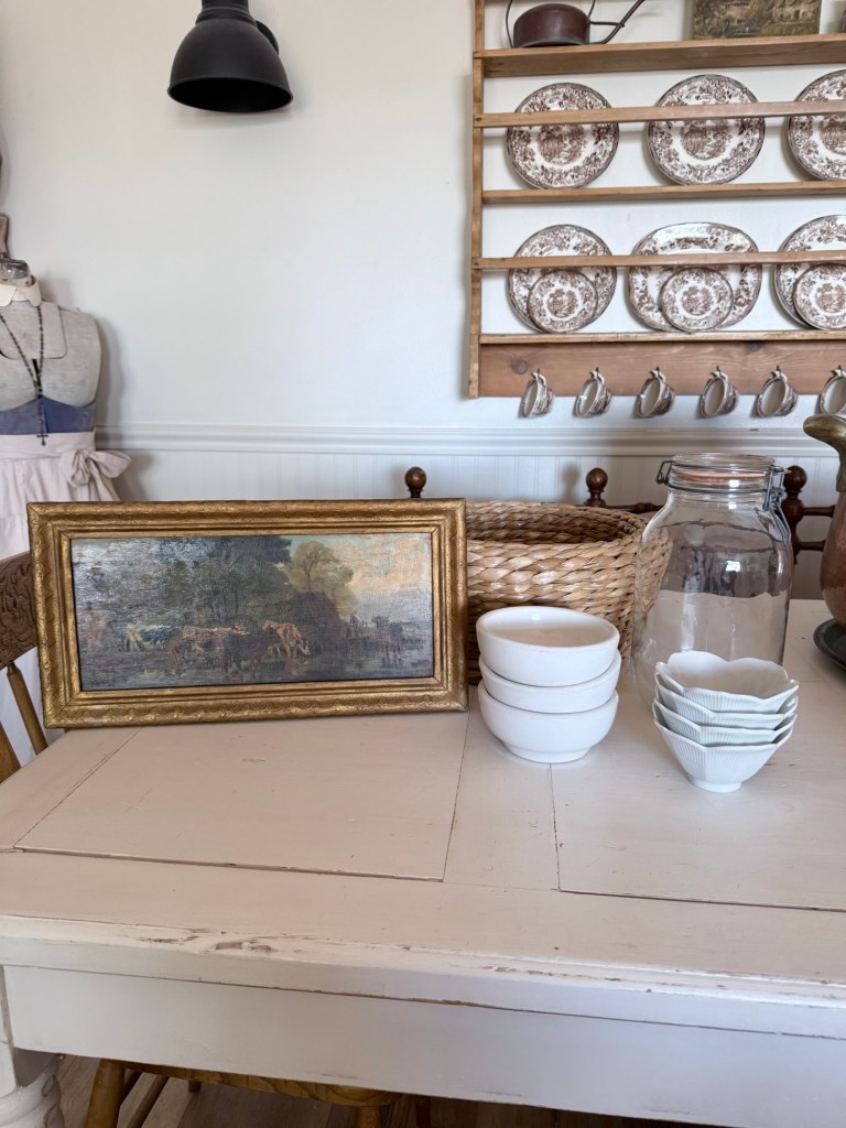 Leah and I went #thrifting today ❤️❤️ Her haul… a wedding veil, champagne glass and coloring books! I found a few fun things as well 😉 The painting is from my friend @vintage_oils I love it! #furnitureattiffanys #handmedowncottage #homedecor #vintage #antique #thriftstorefinds #deseretindustries #thriftingwithleah