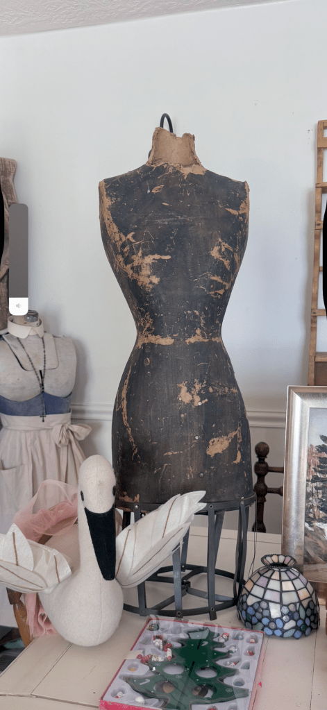 My antique dress form I found the other day styled 🤍🖤🤍 She still needs a name… any suggestions? #furnitureattiffanys #handmedowncottage #brocante #dressform #mannequin #old #antique #styled #homedecor #mirrors
