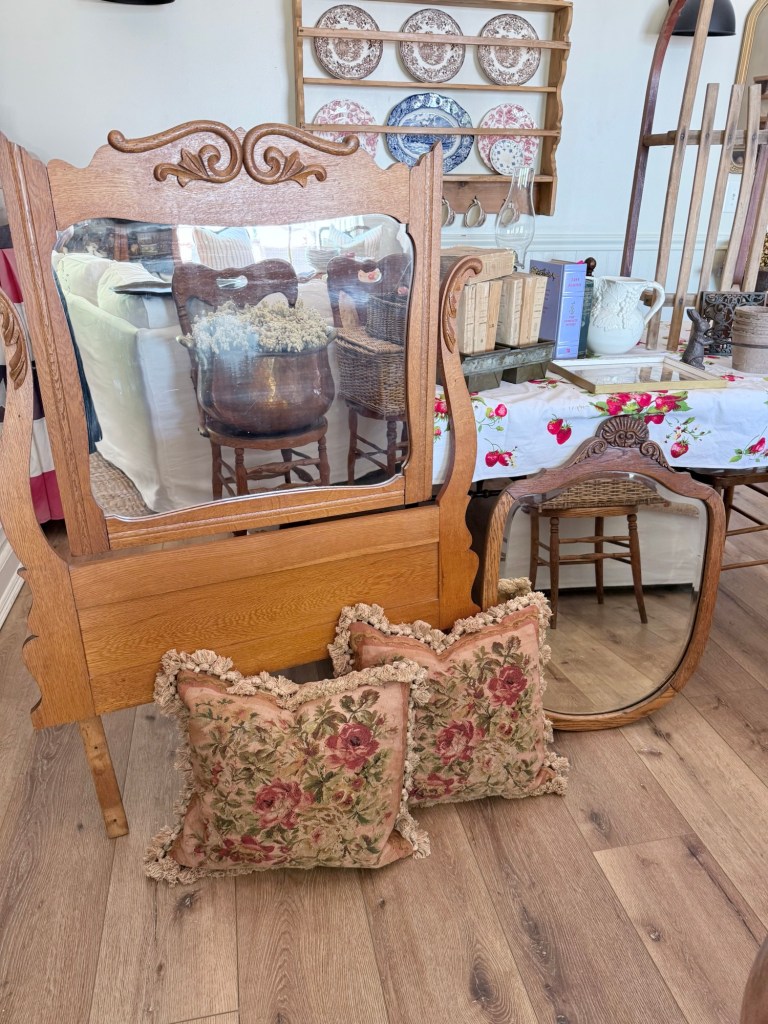 Todays finds 🩷 What would be your fav? Mine are the awesome pillows my friend had in her cart but decided to let me buy 🩷 Thrifting friends are the best! #furnitureattiffanys #handmedowncottage #homedecor #vintage #antique #thriftstorefinds #thrifting #deseretindustries #thrift #thriftingfriends