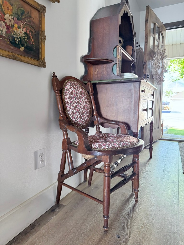 The sweet little antique chair I found the other day styled 🤍 I’ve been on the hunt for a little chair for this spot… and this darling fit the bill 🤍 #furnitureattiffanys #handmedowncottage #homedecor #antique #antiquechair #funfind