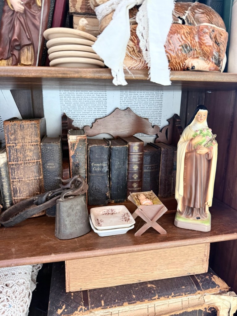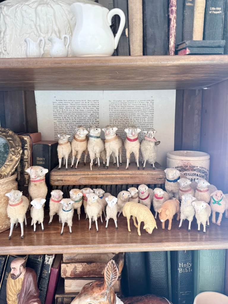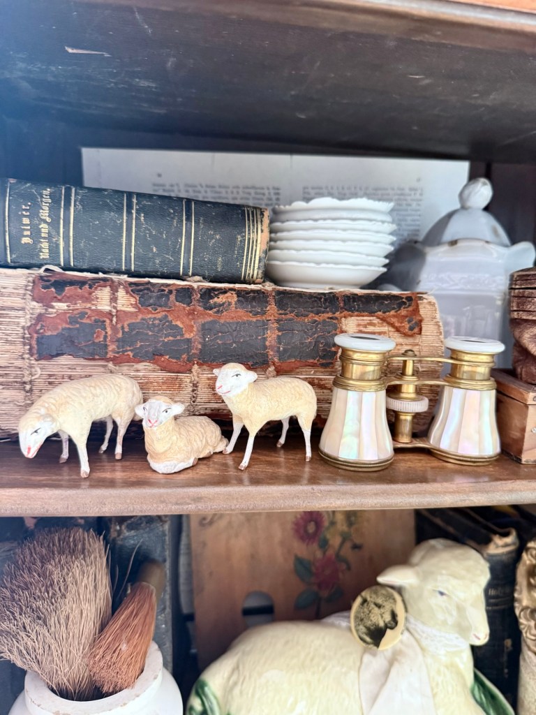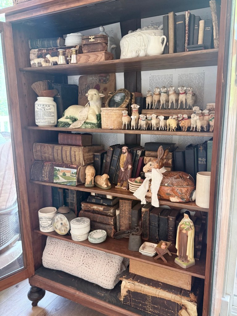 A few of my favorite things 🤍 #cabinet #furnitureattiffanys #handmedowncottage #homedecor #vintage #antique #antiquecabinet #sheep #putz #collections #antiquebibles #bible #bunny #art #tiny