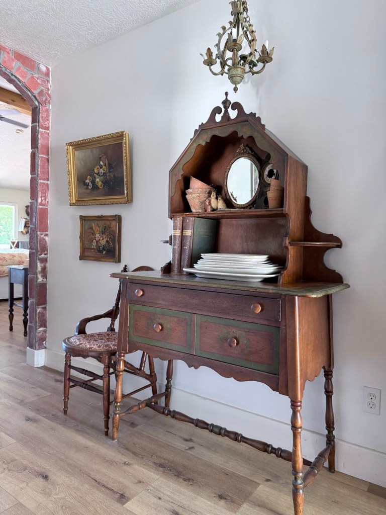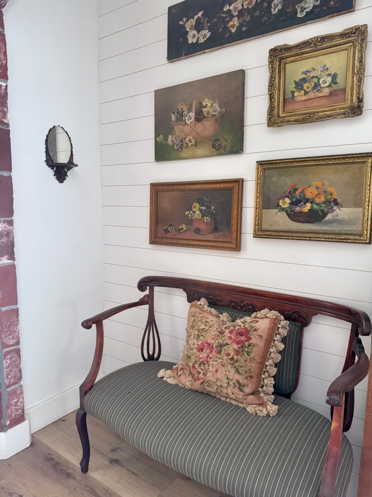 I’ve said it many times but… our entryway is my fav room in our home 🤍 We closed off a wall that was supposed to be open to a front sitting room when we built. We needed an extra bedroom 😉 But in the process we created the most charming little entryway 🤍 #furnitureattiffanys #handmedowncottage #homedecor #vintage #antique #art #pansypaintings #pansyflower #antiquefurniture #myfavoriteroom #happy