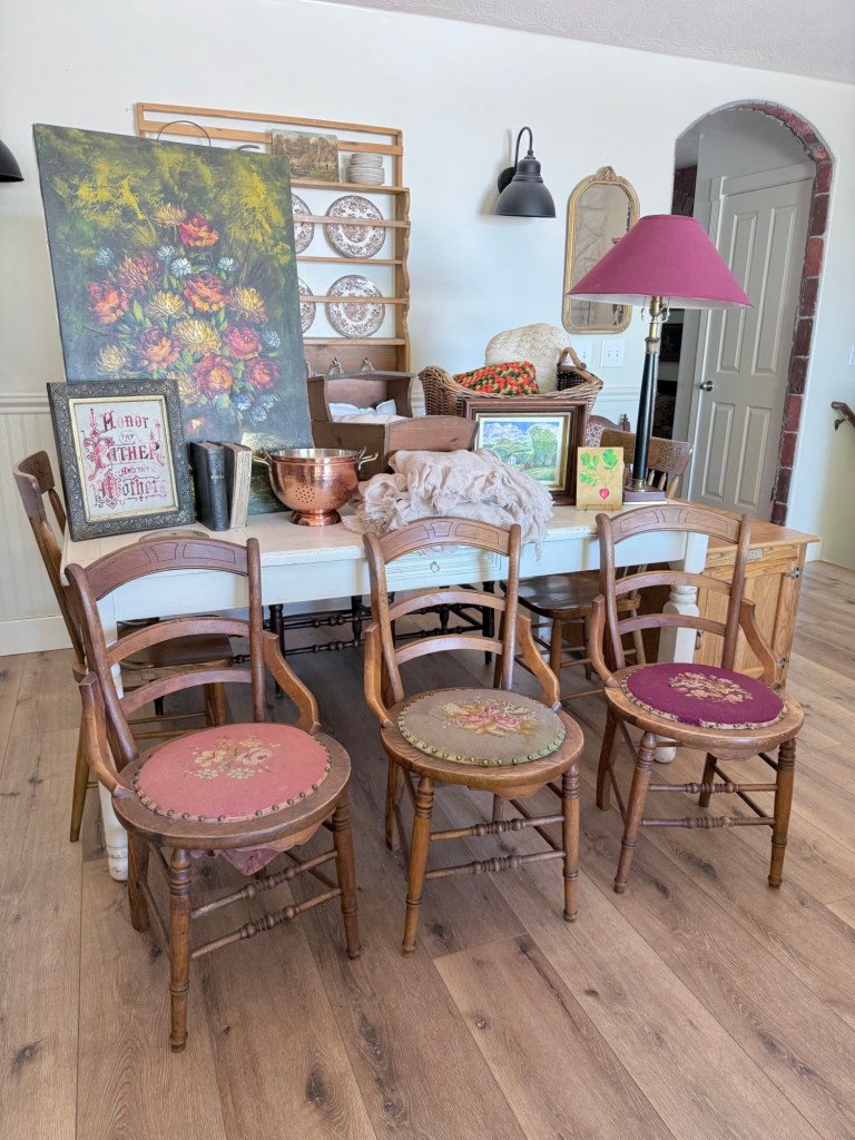 Todays finds 🤍 What would be your fav? I adore the chairs and the old clock face 🤍 #furnitureattiffanys #handmedowncottage #homedecor #vintage #antique #thriftstorefinds #art #thrifting #antiquechairs #clockface