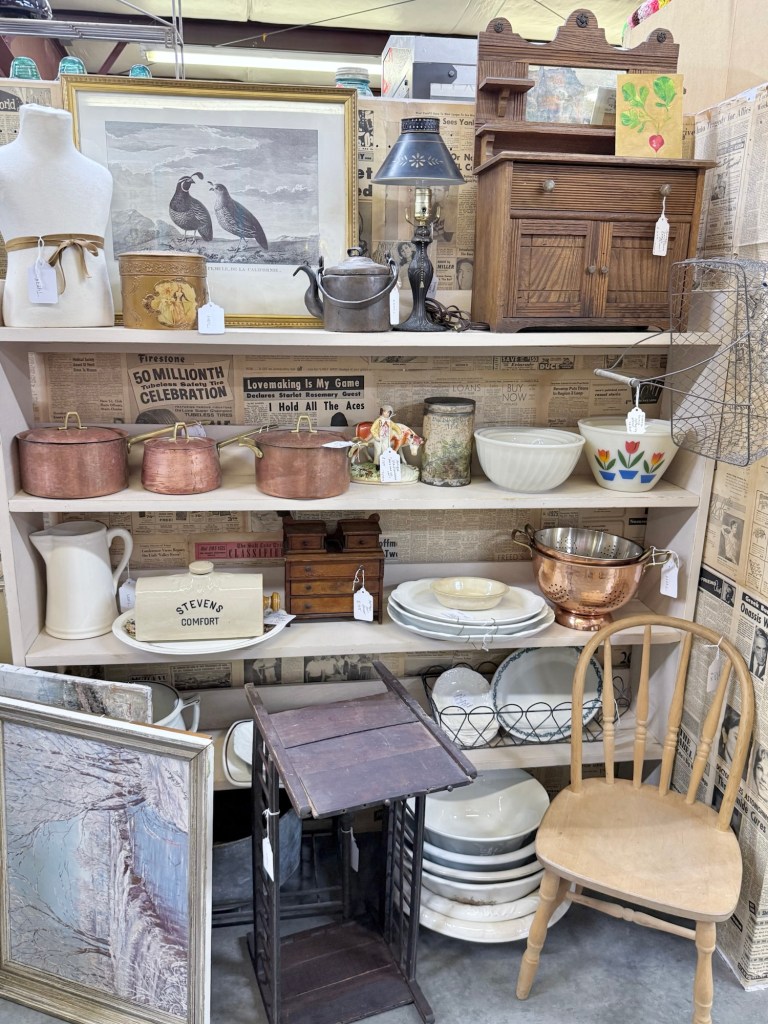 All set up @treasuresspringvilleutah 🤍🤍🤍 I am going to be bringing some more treasures tomorrow too! Come and shop! I’m in the North building right in the middle! So excited to be here! #furnitureattiffanys #handmedowncottage #homedecor #vintage #antique #art #ironstone #copper