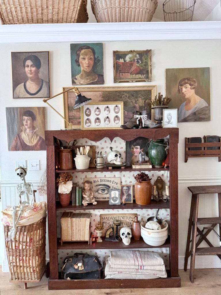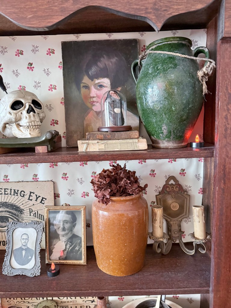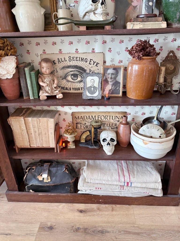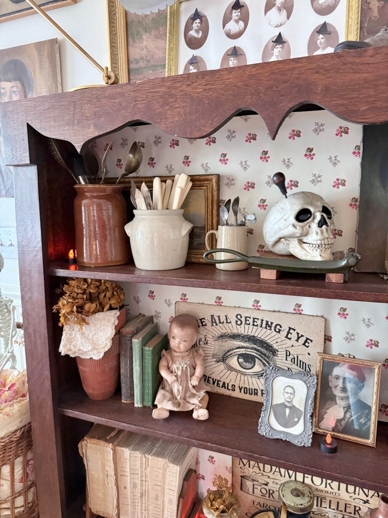 This years “witches cabinet” 🖤🧙🏻♀️🖤 #furnitureattiffanys #handmedowncottage #antique #thriftstorefinds #vintage #art #witchescabinet #halloween #halloweendecor
