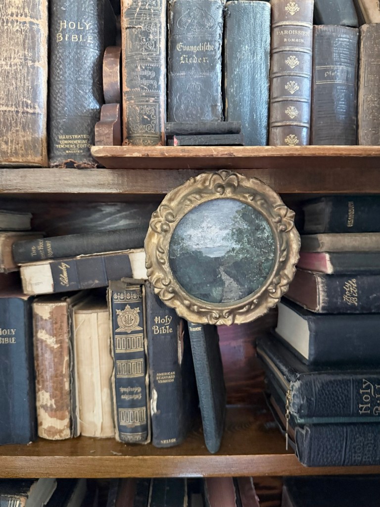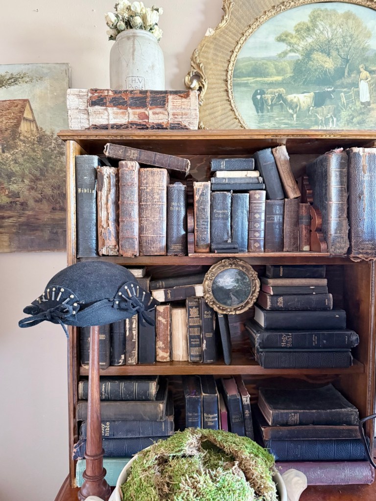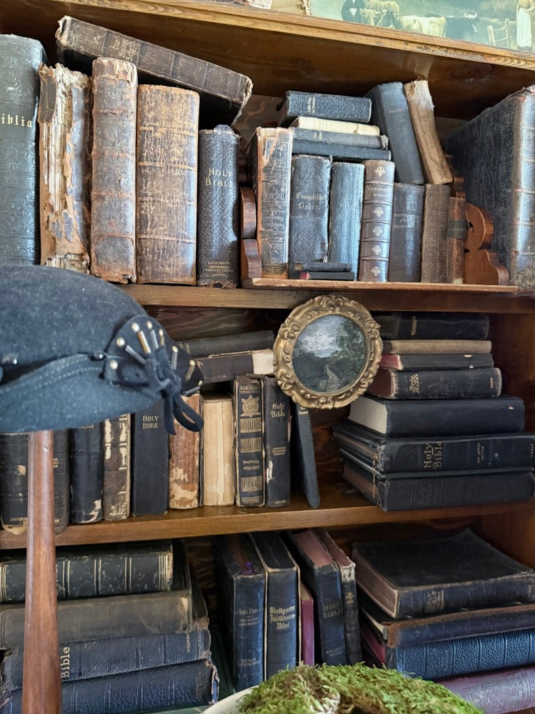 I found this cabinet last week… I listed it for sale but it hasn’t sold. Soooo I was thinking in the middle of the night, as I do 😅, what if it would be perfect for my antique bible collection! What do you think? And the sweet little painting is from @sheridan.curated Please ignore the tv haha 🤎 #furnitureattiffanys #handmedowncottage #antique #bible #biblecollection #antiquebibles #tattered #collection