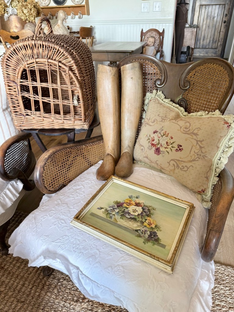 I went to #vintagemarketdays this morning! I saw so many friends, and met some new friends 🤎 Such a fun day! Here is what I found… I don’t think #steviethegirlkitty likes the antique animal carrier I found 😂 #furnitureattiffanys #handmedowncottage #homedecor #vintage #antique #art #pansypainting #european #bootforms #pillow #basket