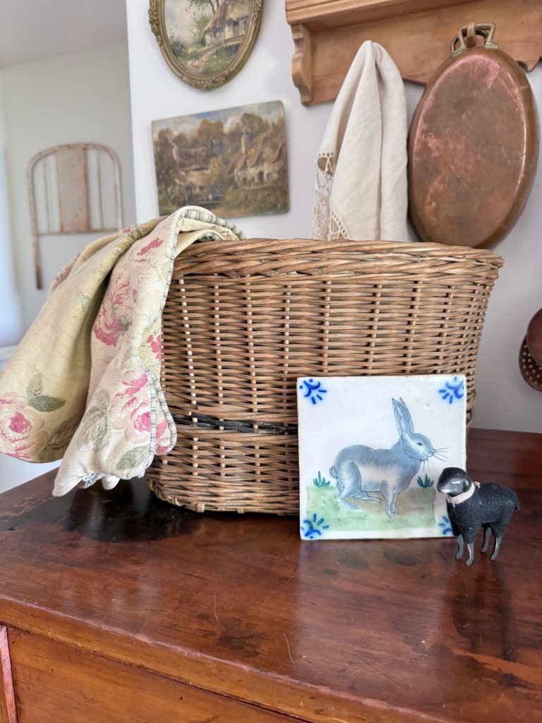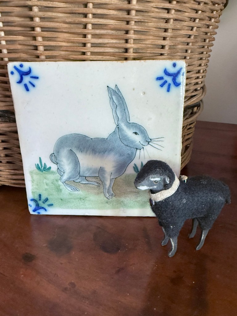 My fun finds from @flea.o.logy today 🤍 #furnitureattiffanys #handmedowncottage #homedecor #vintage #antique #bunny #tile #sheep #europeanbasket