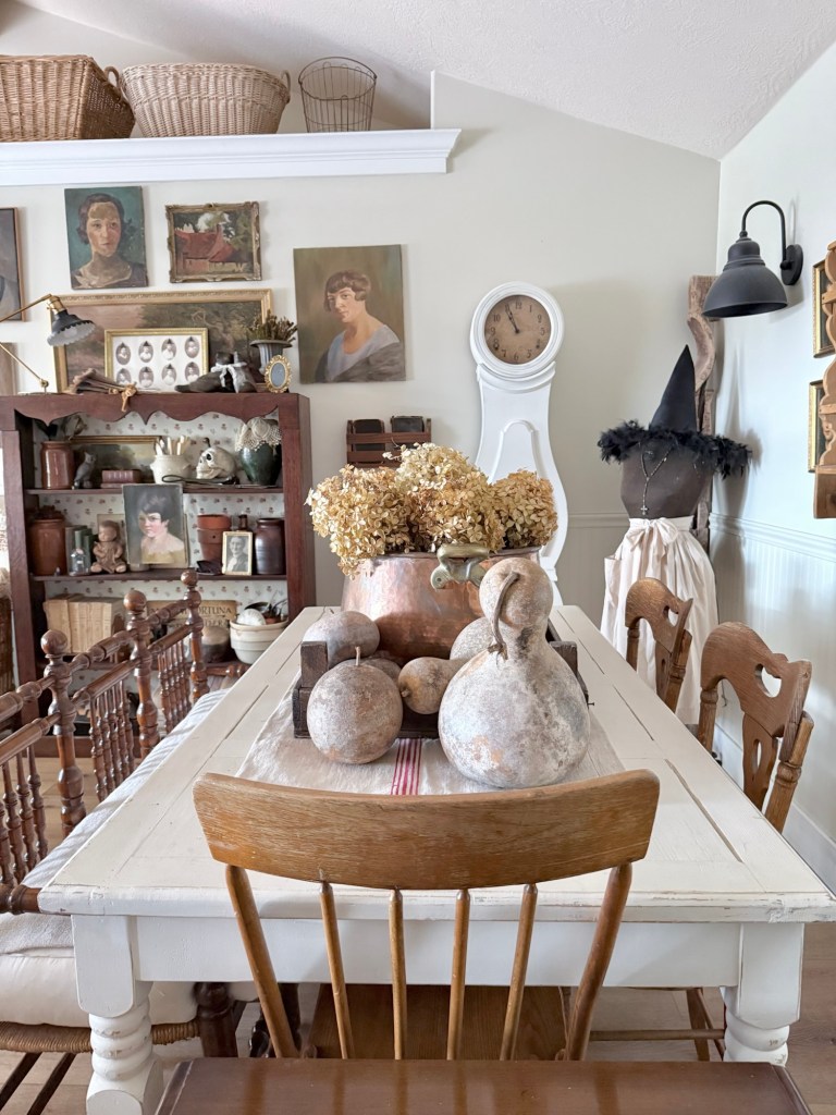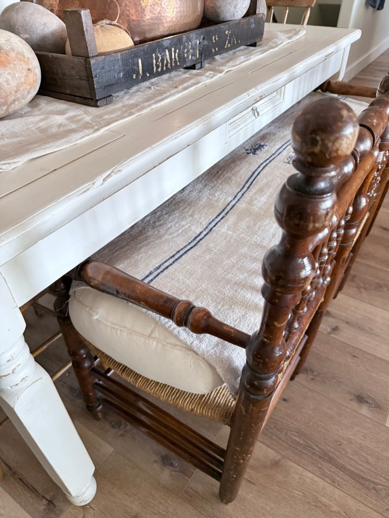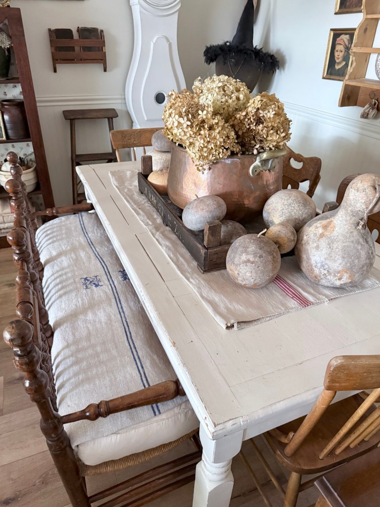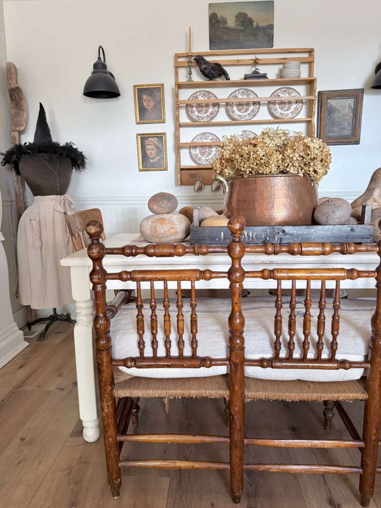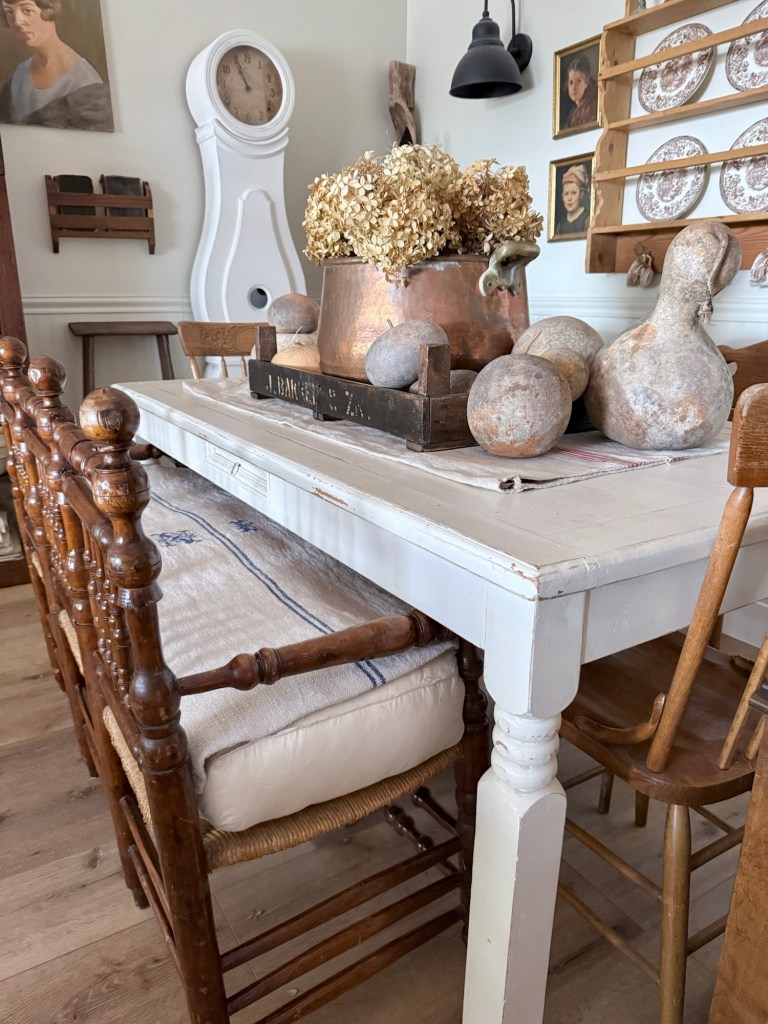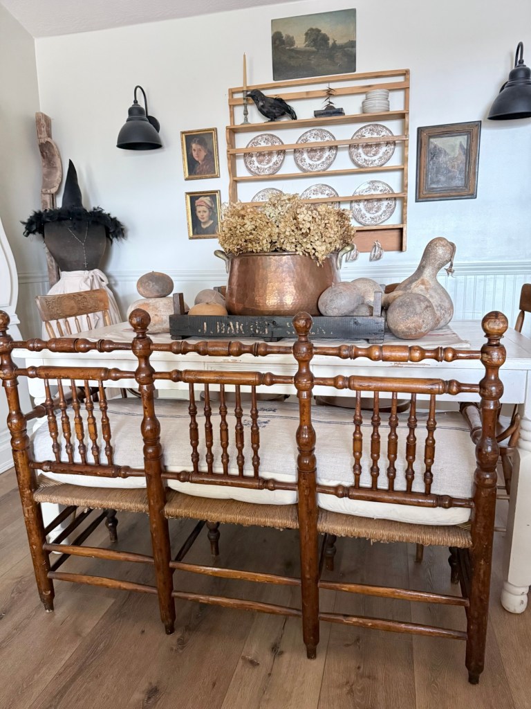 Happy Monday! I swapped my chairs with my bench at the dining table… what do you think? 🤎 #furnitureattiffanys #handmedowncottage #homedecor #antique #vintage #art #copper #antiquefurniture #antiquebench #swap #diningroom