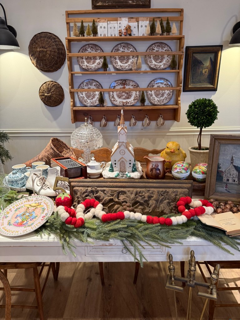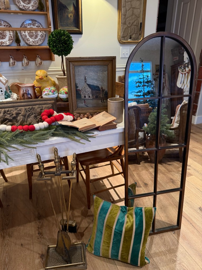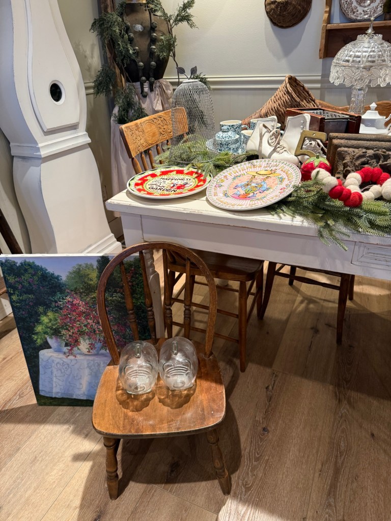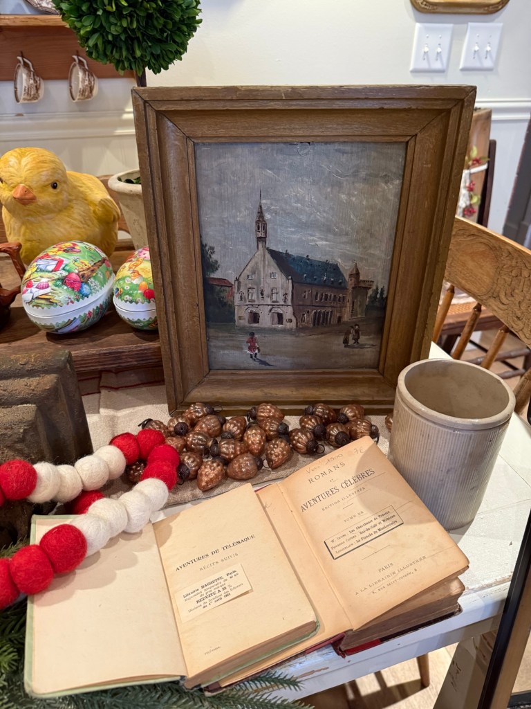 Today’s finds ❤️ what would be your fav? I love the French painting and French antique books ❤️ #furnitureattiffanys #handmedowncottage #homedecor #vintage #antique #thriftstorefinds #art #thrifting #skates #mirror #spongeware