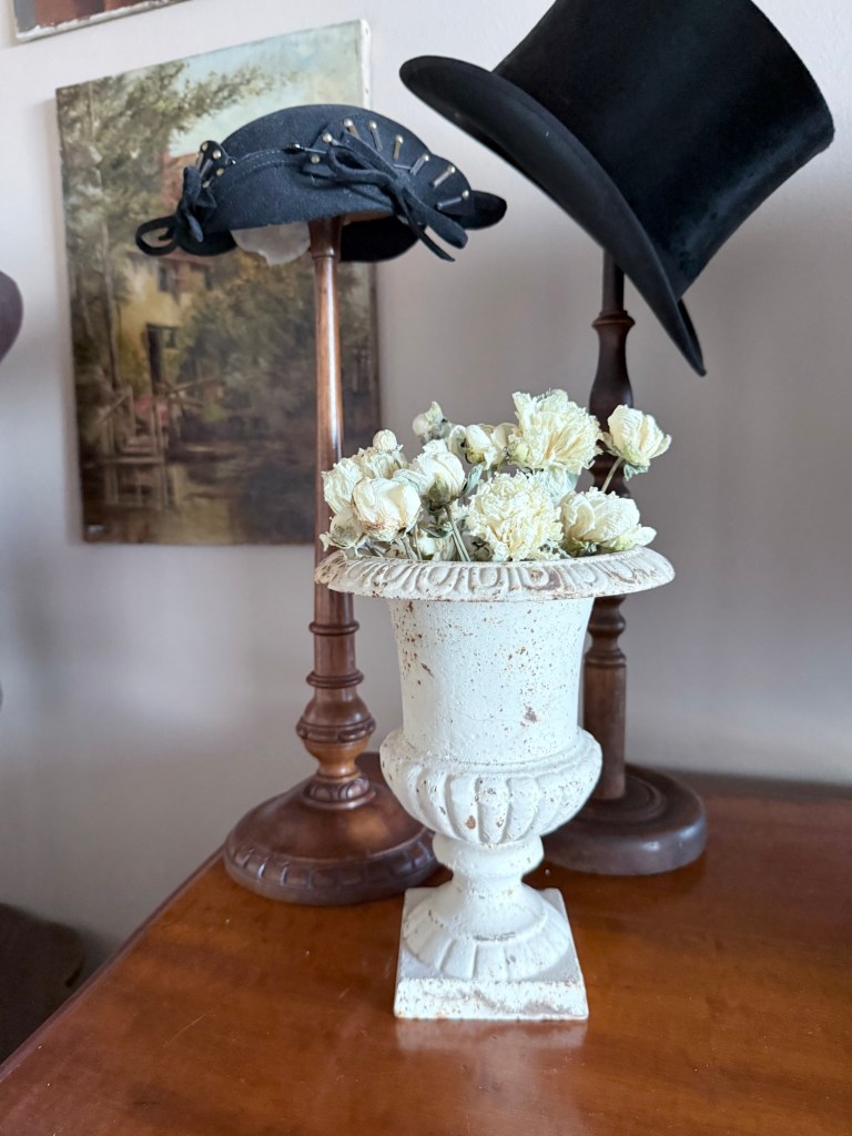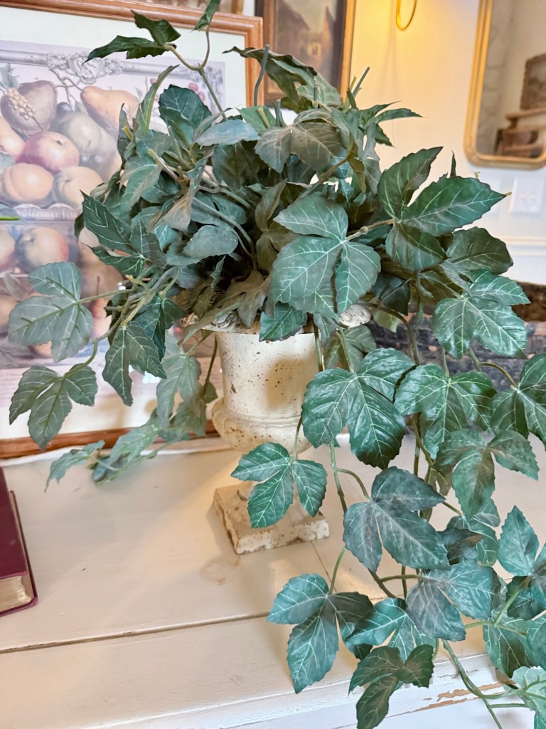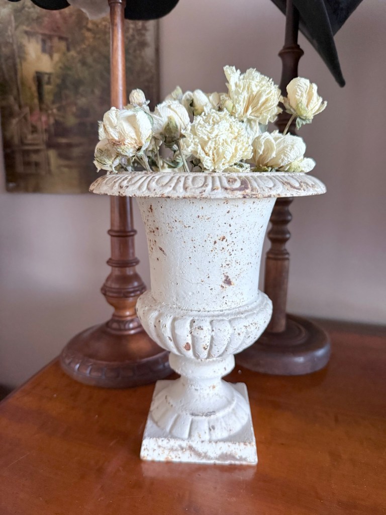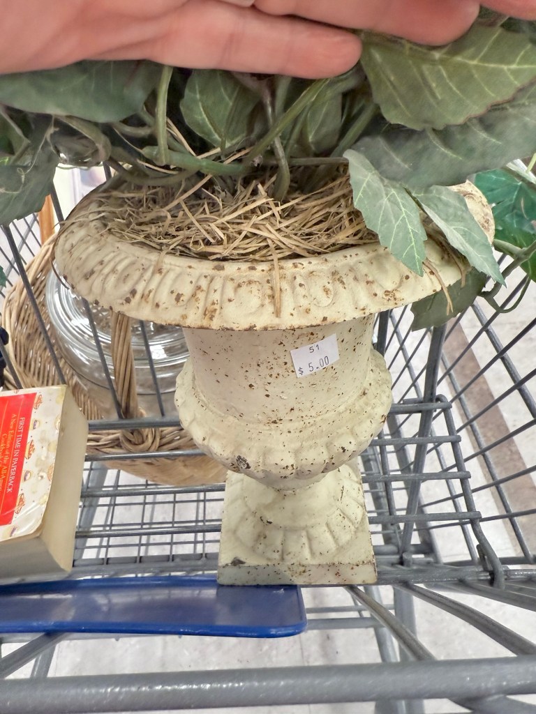 When thrifting, always check the florals! I hated the fake plant… but underneath? An antique cast iron urn 🤍 I found this @deseret_industries #furnitureattiffanys #handmedowncottage #thriftstorefinds #castiron #urn