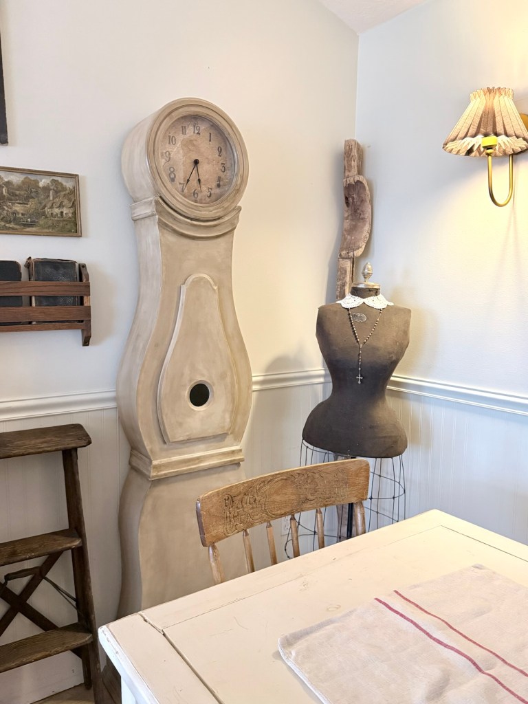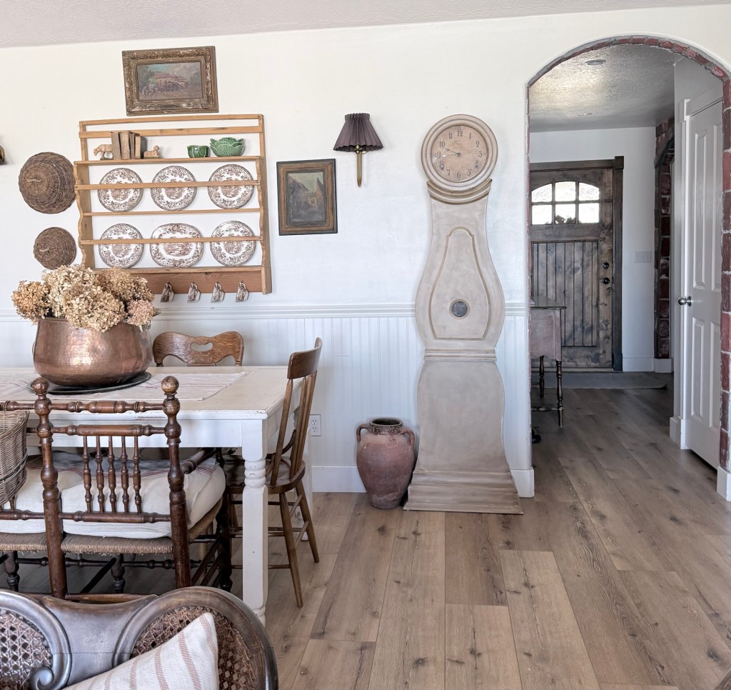 I stained my mora clock, moved it to the other wall in my dining area and expanded my gallery wall 🤍 What do you think? #furnitureattiffanys #handmedowncottage #art #moraclock #gallerywall