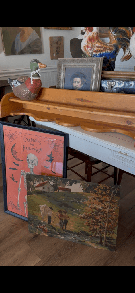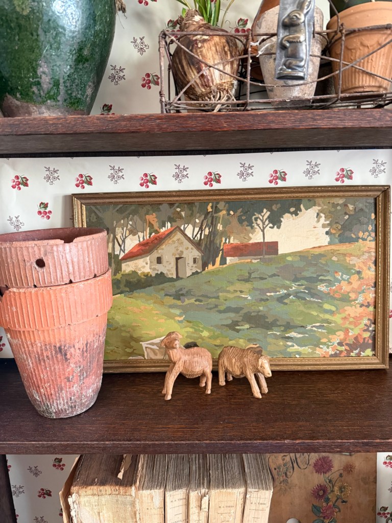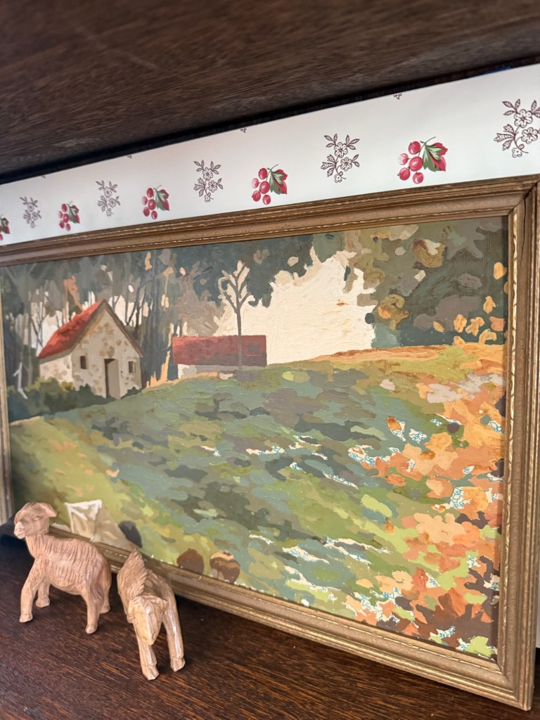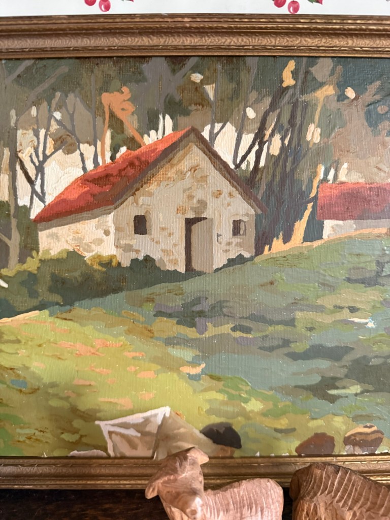 I thrifted this vintage paint by number @deseret_industries last week. I loved the little cottages so I trimmed it down and framed it ❤️ There are spots that weren’t finished with paint, but it adds to the charm #furnitureattiffanys #handmedowncottage #thriftstorefinds #art #paintbynumber