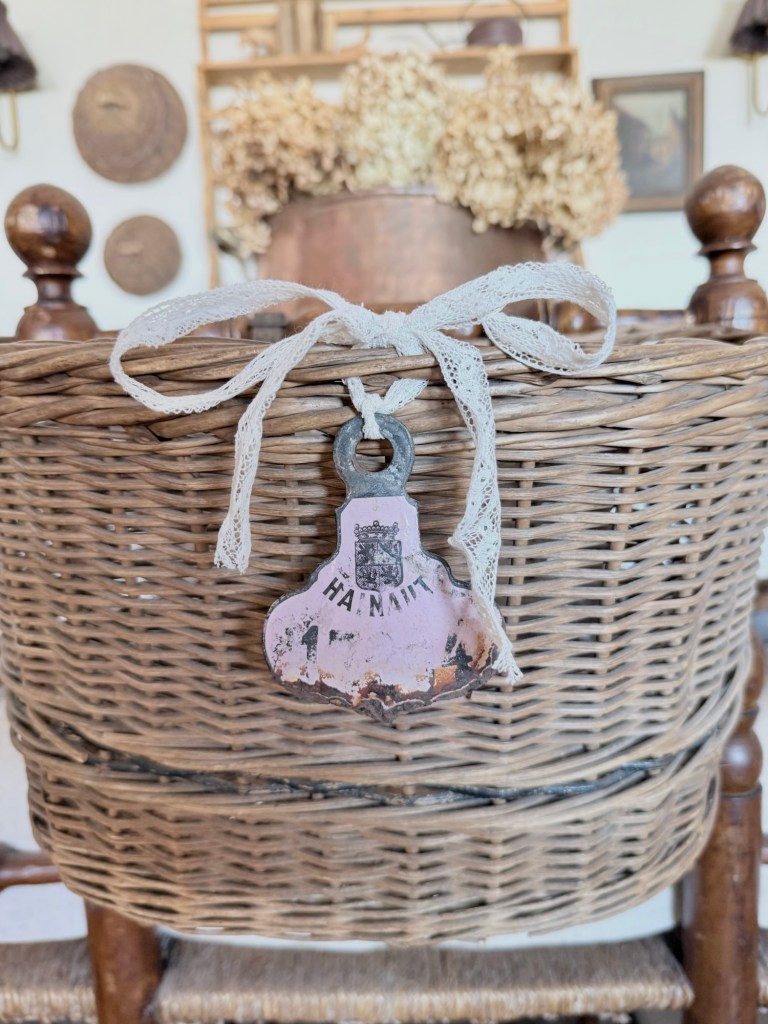 I had forgotten about this amazing antique European bicycle tag I got from my friend @thewhiteishstudio 🩷 it’s pink and chippy and lovely! And it’s perfect on my old bike basket 🩷 #furnitureattiffanys #handmedowncottage #bikebasket #pink #european